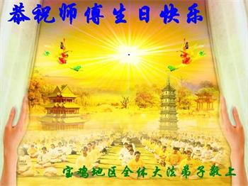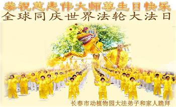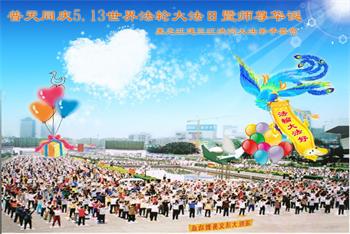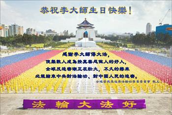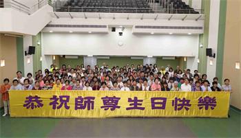 下午四点,庆典圆满结束之际,法轮功学员集体合影,齐颂“恭祝师父生日快乐!法轮大法好!真善忍好!”