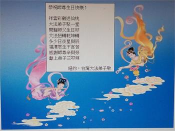 珍妮前来参加当天的活动,她说:“因为法轮大法给予我的太多了,任何能回报的机会我都不会放过,师父给我这么多,我得过来祝贺师父生日。”