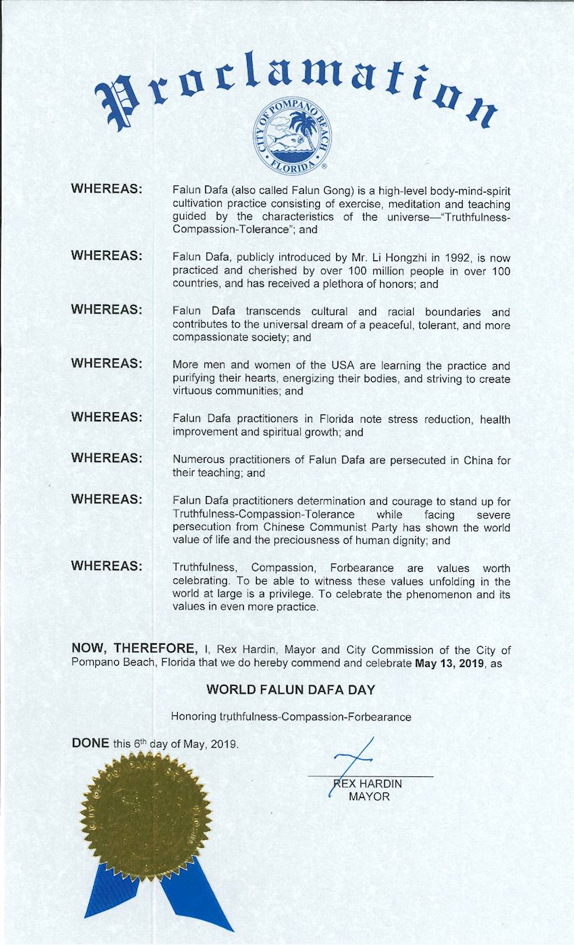 因此,现在我,Rex Hardin,庞帕诺海滩(City of Pompano Beach)市长,特此宣布二零一九年五月十三日为庞帕诺海滩市世界法轮大法日,并颂扬真、善、忍!