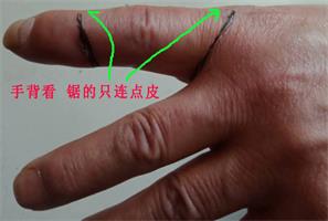 我插上电源正要锯时,发现离窗户太近,就放下木头往前挪电锯,谁知瞬间锯到左手了!呀!忘拔电插头了。我摘下手套一看,食指从第二节耷拉下来,只剩点肉皮连带着。食指与中指间(手掌处)也锯了一道大口子,肉外翻,露出白骨。