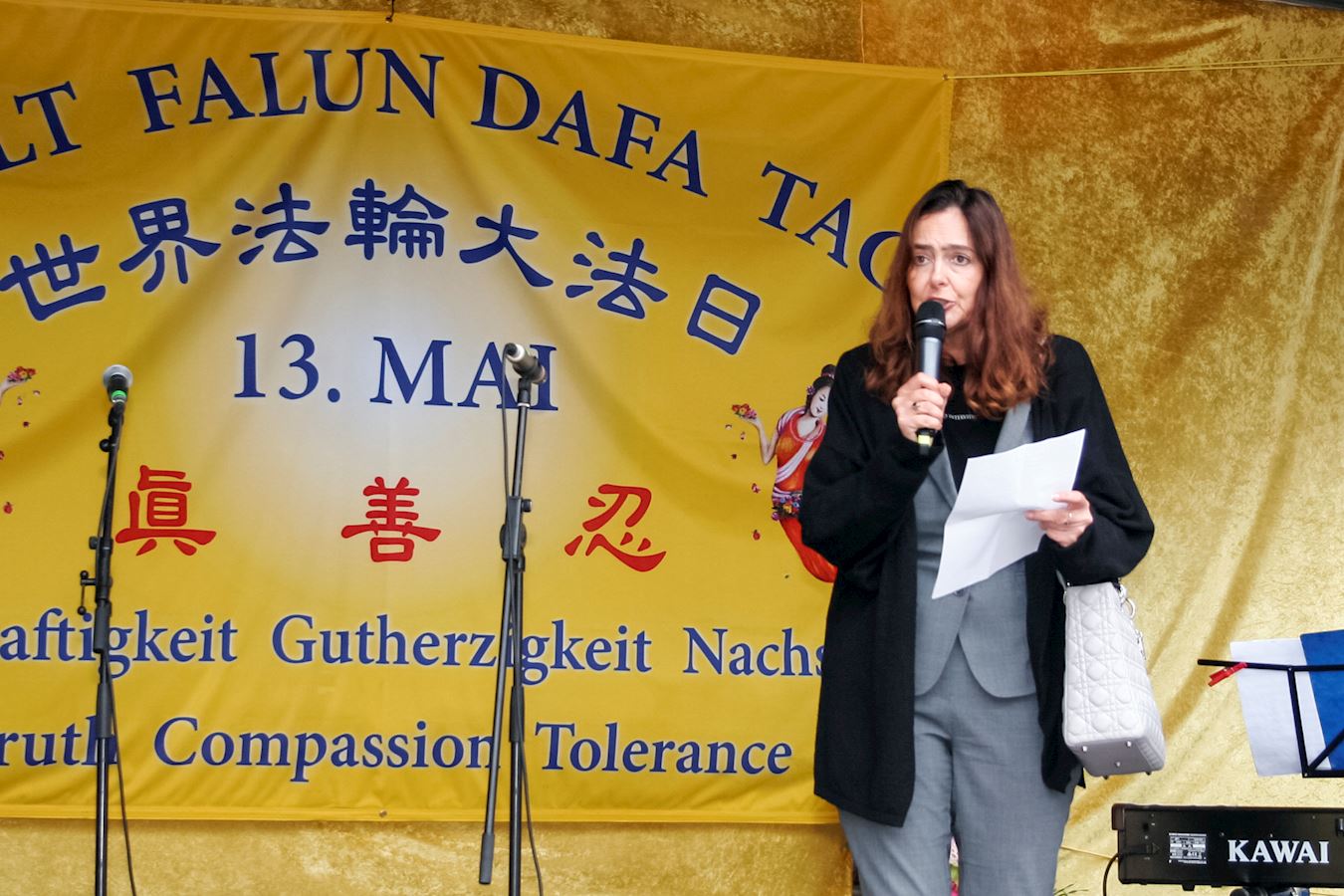 德国国会议员乌丽珂·尼森(Ulrike Nissen)到场致词,她说:在二零一九年五月十三日这一天,人们将庆祝世界法轮大法日二十周年。这个特殊的日子是为了庆祝法轮大法的精神实践而设立的。