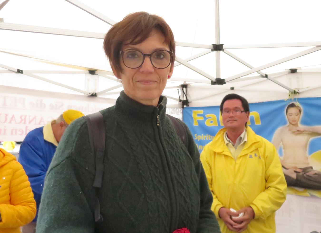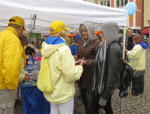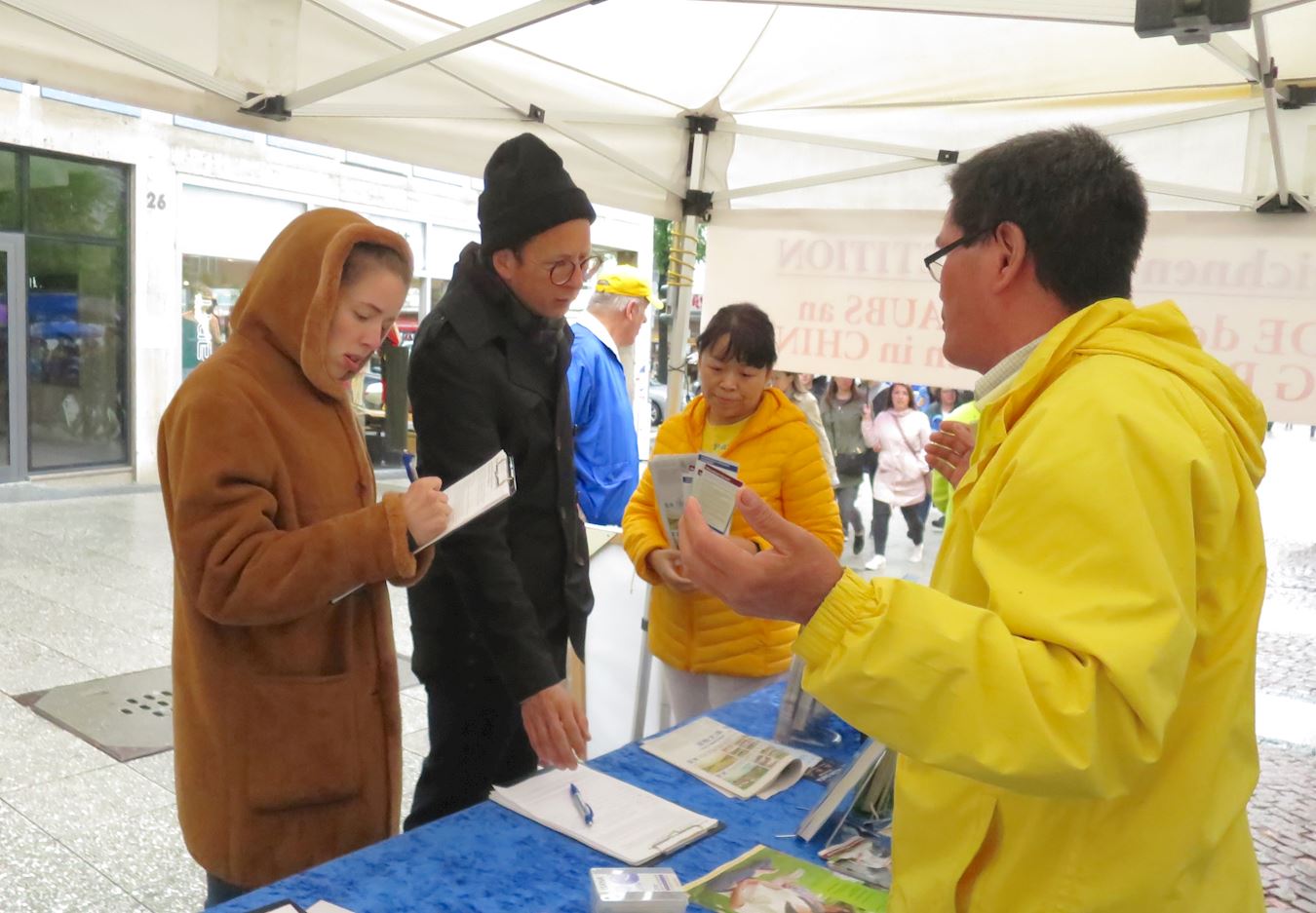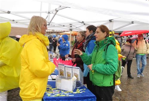 公关培训师克尔斯汀·库实女士(Kerstin Kuschel)在信息台前逗留了很长时间,她详细了解法轮功是什么、为什么中共会迫害法轮功,并打听能够帮助法轮功学员的各种渠道。之后,她签名声援法轮功学员。