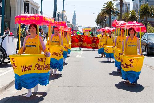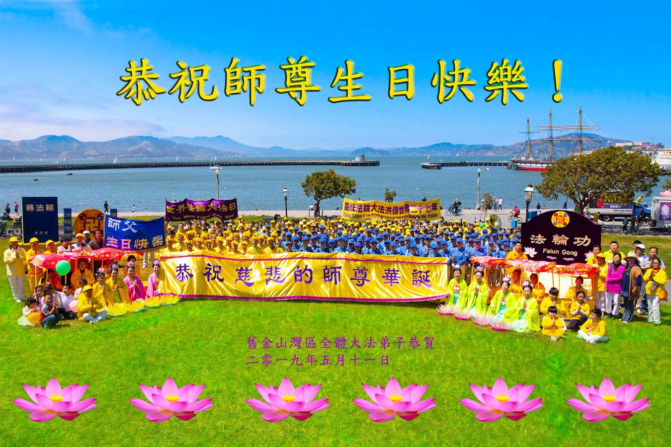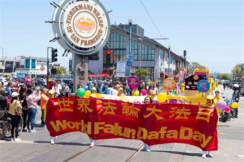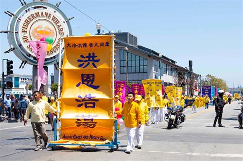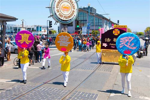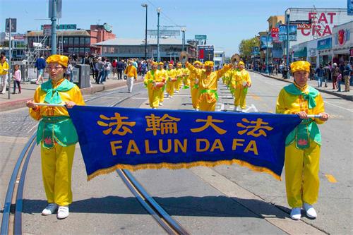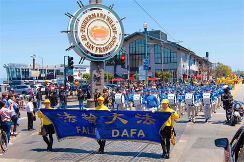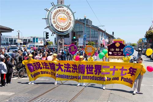 【明慧网二零一九年五月十三日】(明慧记者王英旧金山报道)二零一九年五月十三日,是法轮大法洪传世界二十七周年纪念日,也是法轮功创始人李洪志大师的六十八华诞,普天同庆。五月十一日,美国旧金山法轮功学员在渔人码头旅游景点游行,恭祝师父华诞,庆祝“世界法轮大法日”,并希望民众都来了解法轮大法的美好。