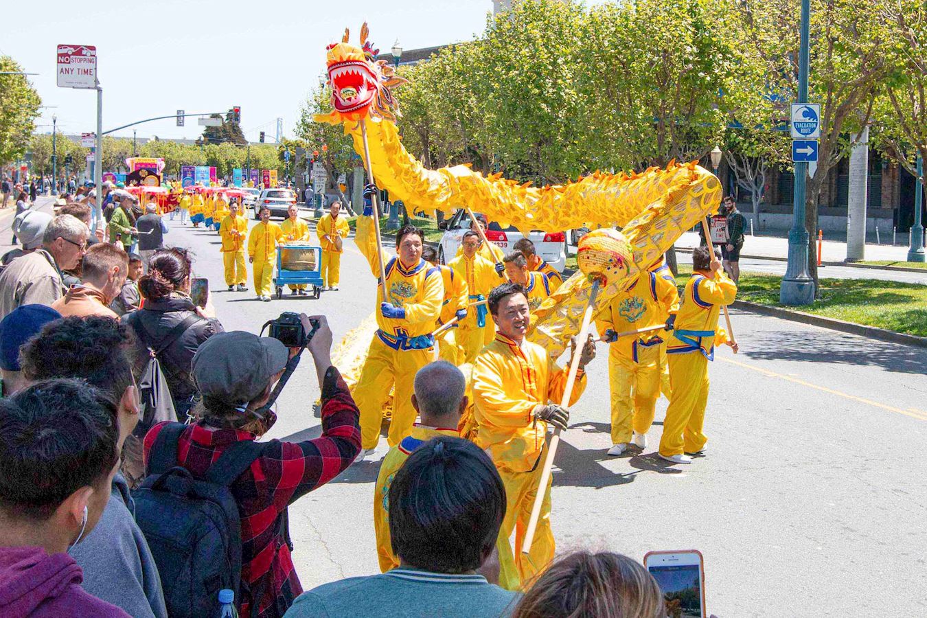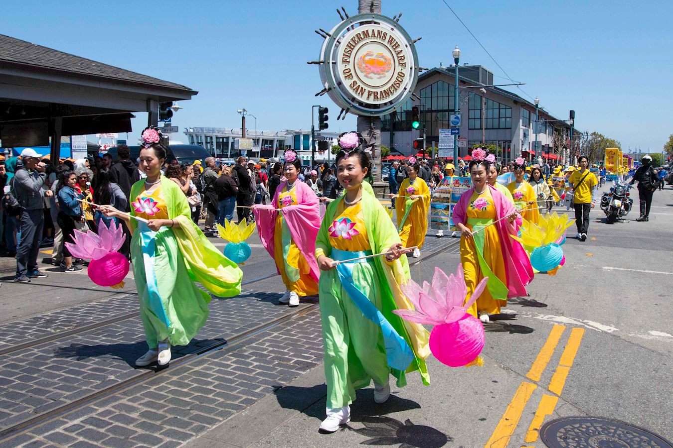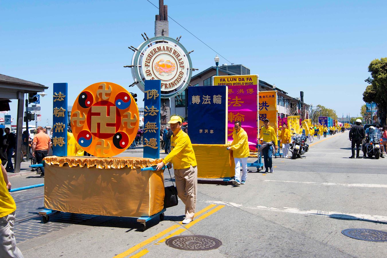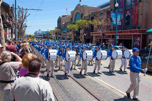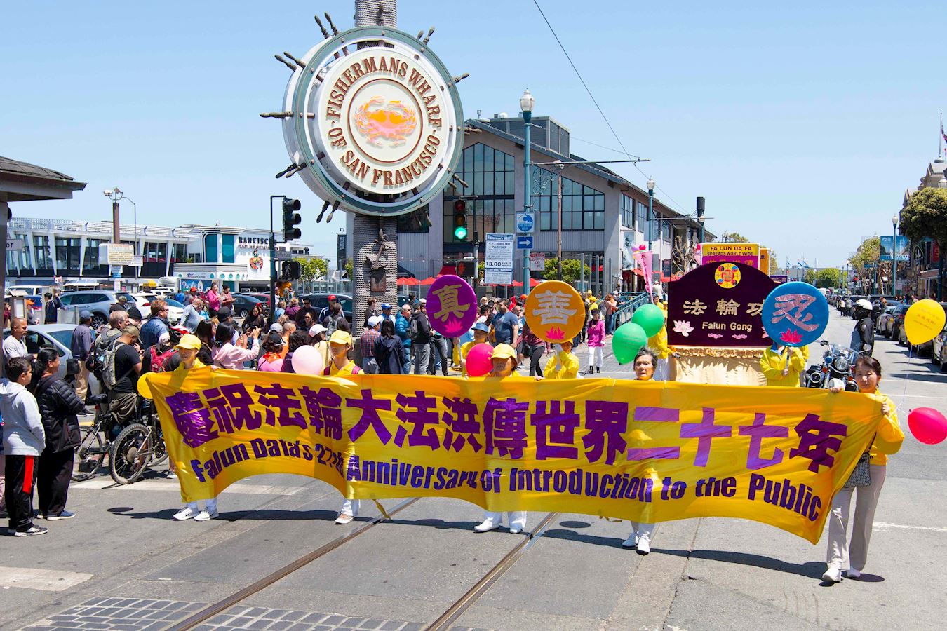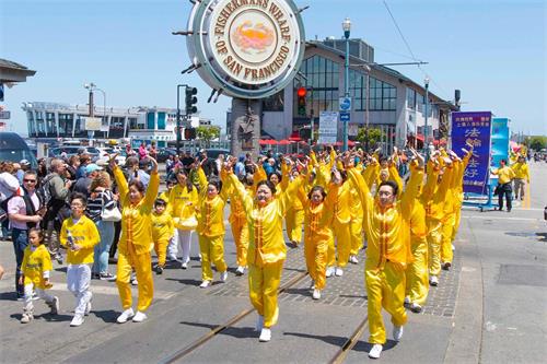 '图1~18:旧金山法轮功学员在渔人码头旅游景点游行,恭祝师父华诞,庆祝“世界法轮大法日”。'