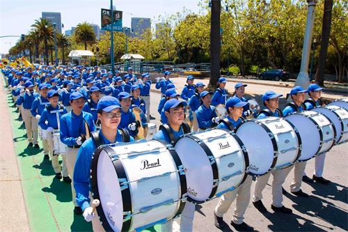 上午十二点,庆祝游行开始。游行队伍由阵容庞大的天国乐团前导,随后是舞龙队,接着是拿着各种横幅的队伍,上面写着:“世界法轮大法日”、“法轮大法好”等,炼功队伍展示祥和五套功法。还有花车、小花船、唐鼓队及腰鼓队等,浩浩荡荡。