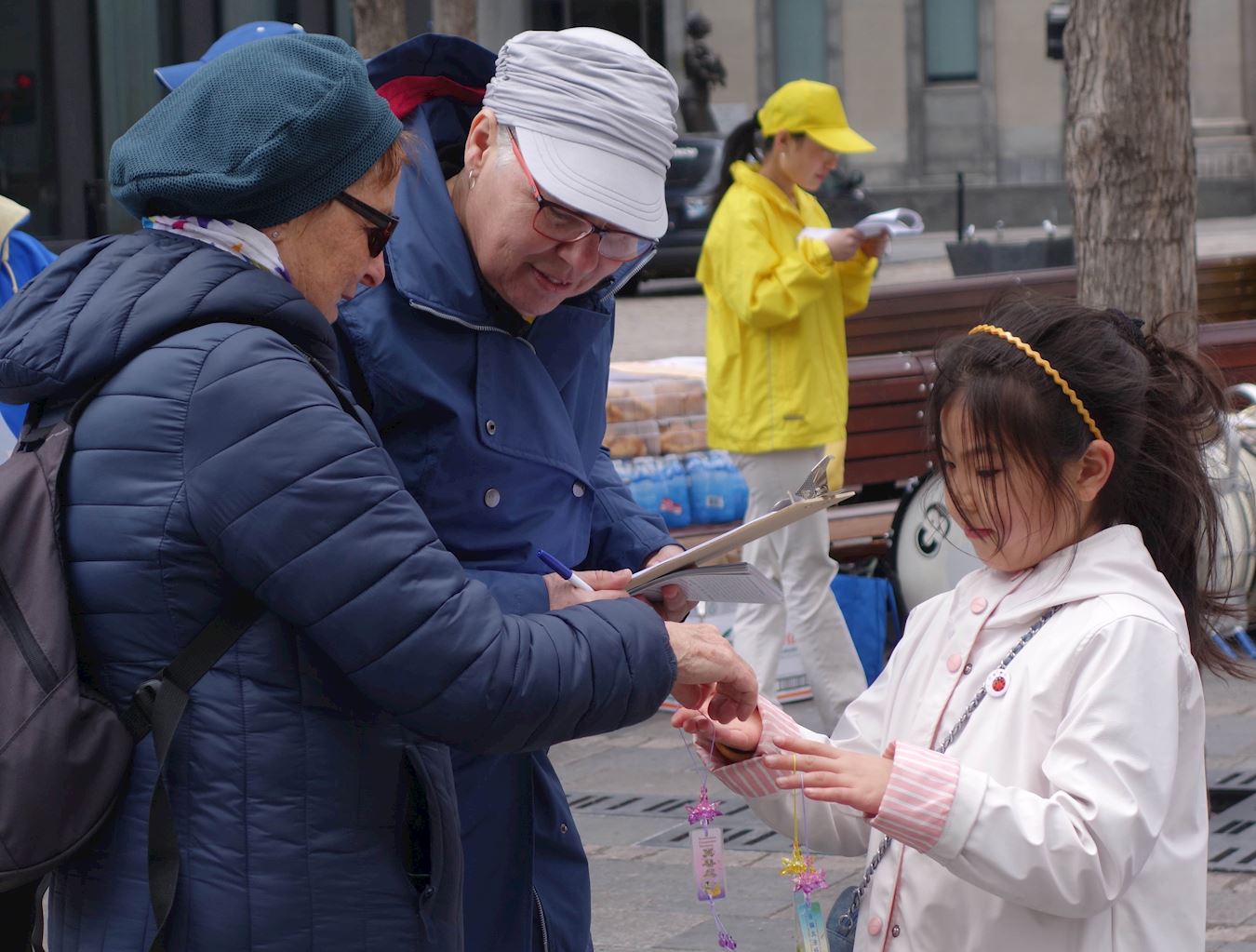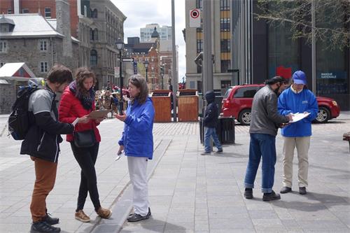 蒙特利尔的兵器广场是知名的旅游景点,汇集着来自世界各地的游客。法轮功学员祥和的活动场面吸引了众多游人来到真相展板前,与法轮功学员交谈,很多人对发生在中国的迫害感到震惊,纷纷在呼吁停止迫害、营救国内法轮功学员的征签表上签名。