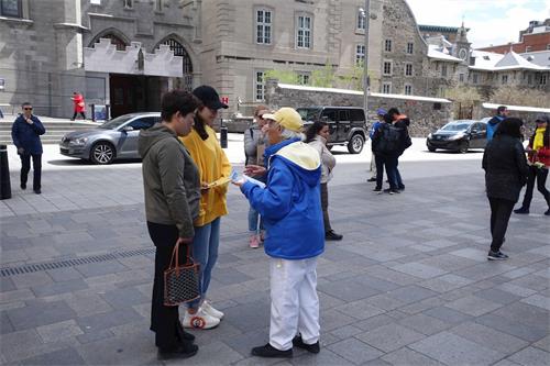 ![]() 图2~6:蒙特利尔法轮功学员聚集在老城兵器广场(Place D’arms)欢庆世界法轮大法日,庆祝大法弘传27周年,吸引路人驻足了解真相。 |