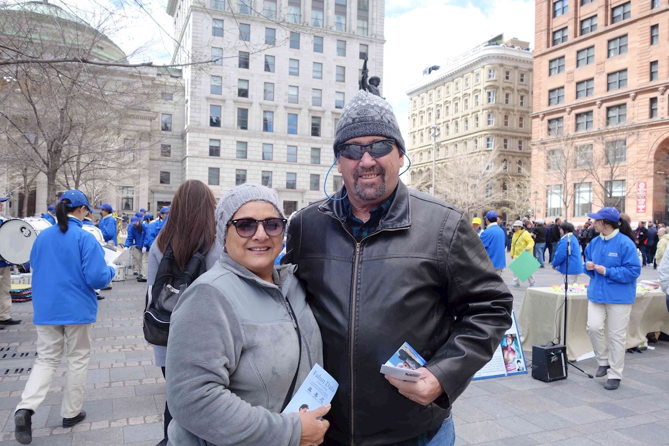 来自加勒比海波多黎各(Puerto Rico,美属小岛)的罗伯特·拉莫斯(Robert Ramos)和尼尔萨·拉莫斯(Nielsa Ramos)夫妇,认真询问了法轮功是什么,为何在中国遭受迫害,了解真相后罗伯特·拉莫斯称赞法轮功揭露迫害的勇气,“你们做得很好,表达出来,让世界都知道。信仰不应该被禁止,人有信仰的自由。”同时,他谴责共产极权对人民思想的箝制,“中国是共产极权,没有民主,政府要你怎么做就得怎么做。幸运的是,这里是加拿大,你们可以自由地做自己想做的事情。”
