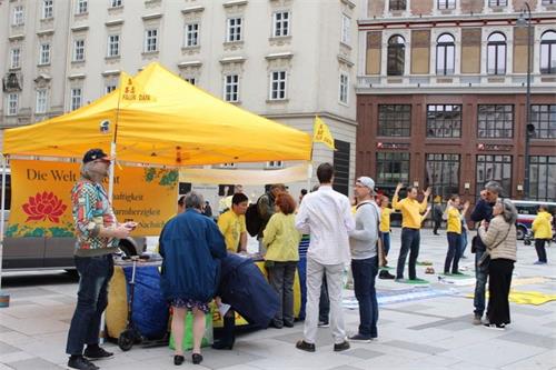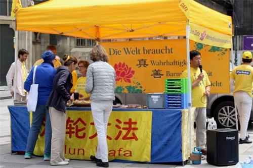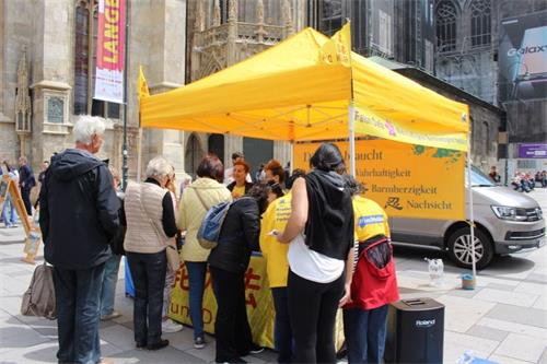 【明慧网二零一九年五月十四日】二零一九年五月十三日这一天是“世界法轮大法日”,奥地利的法轮功学员在五月十一日这天,也在维也纳市中心的斯蒂芬广场举办庆祝活动,感恩法轮大法给人们带来的身心健康与道德回升,同时向人们讲述仍在中国发生的对这一信仰团体的残酷。