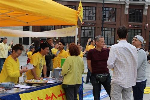学员们在广场上打坐炼功,在信息展位的旁边陈列着一组图片展,显示着在一九九二至一九九九年间,法轮功曾是中国最受欢迎的气功,不分年龄、社会阶层,有上亿的人学炼。随着修炼法轮功的人数超过了共产党员的人数,江泽民出于妒嫉发动了这场已有二十年的残酷迫害,导致数百万人失去生命。图片展中陈列着一组法轮功学员受迫害的照片,是几经辗转传送到海外曝光的。