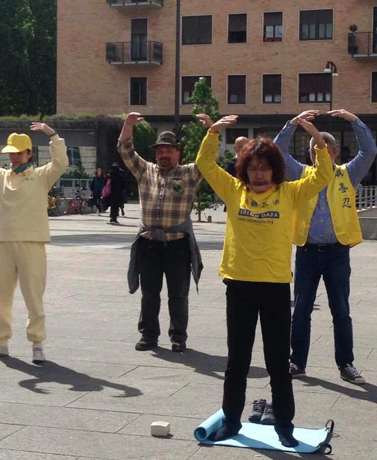 十二日,在米兰金融中心附近的广场,法轮功学员们举行了活动,有许多路人经过那里的时候停下来,露出好奇的神情。有的人观看展板,了解法轮大法洪传全世界的盛况,有的聆听平和的炼功音乐,有的还跟着模仿动作学练。他们当中很多人都是第一次知道法轮大法,他们都表示很高兴知道这里有世界法轮大法日的庆祝活动,并且非常认同法轮大法修炼宇宙特性“真、善、忍”。