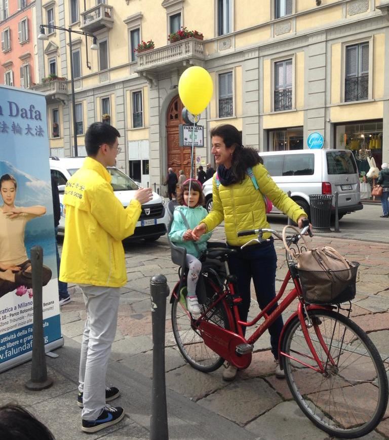 五月十一日,十二日,米兰学员庆祝法轮大法日活动期间,准备了很多写有“法轮大法好”的黄色气球,并且展示功法,和教叠纸莲花。正值意大利的Raduno Nazionale Alpini盛会,约五十万人从全国各地赶到米兰聚会,很多人都借此机会了解了法轮大法的美好。