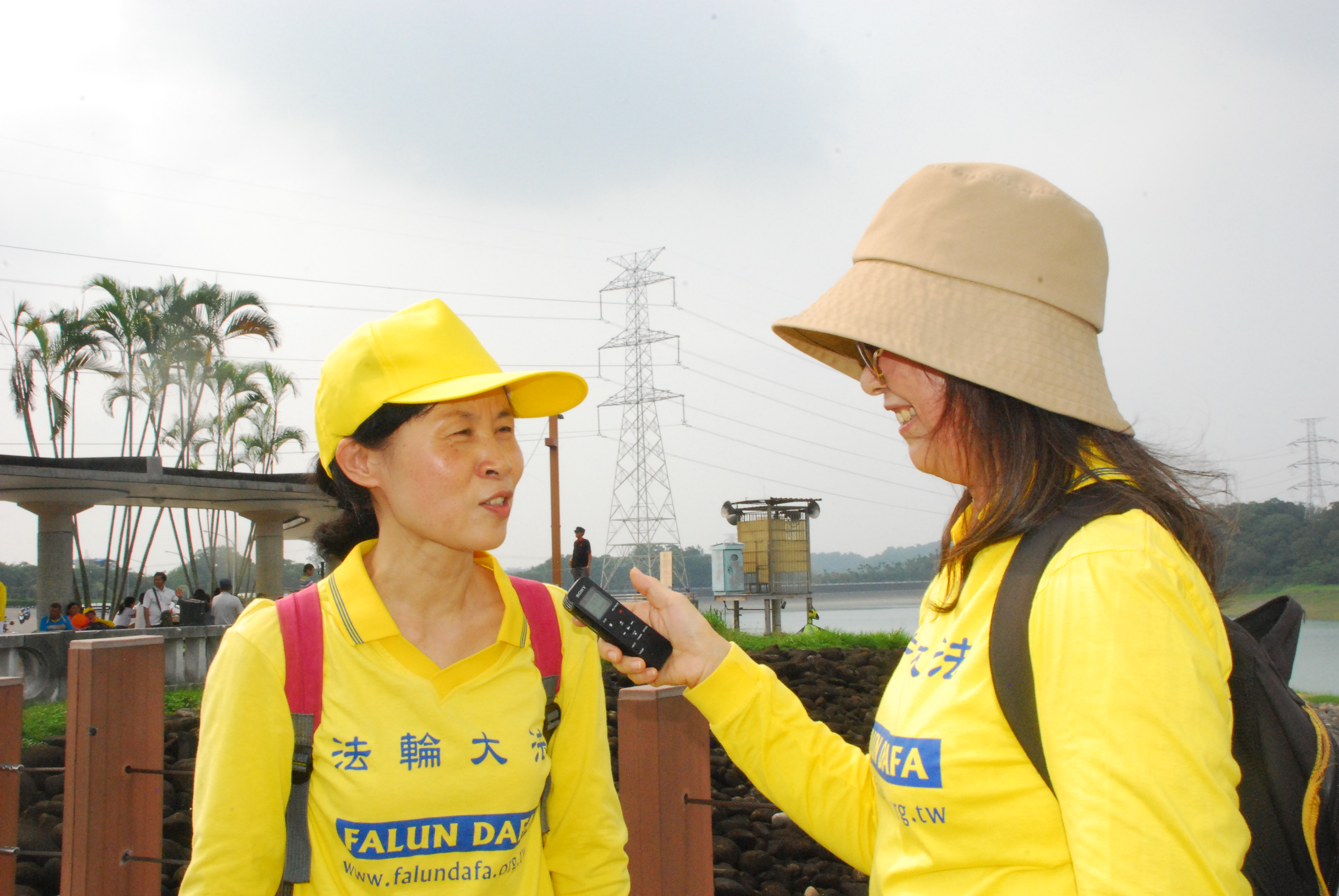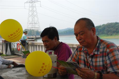 学员徐千文是退休老师,她希望与游客分享法轮大法的美好:“仁义潭是许多人喜欢来的景点,今天天气特别好,大法在台湾弘传很多年,还有许多人不了解,希望更多人了解大法美好,嘉义学员平时也在这里向住饭店的大陆客讲真相。”