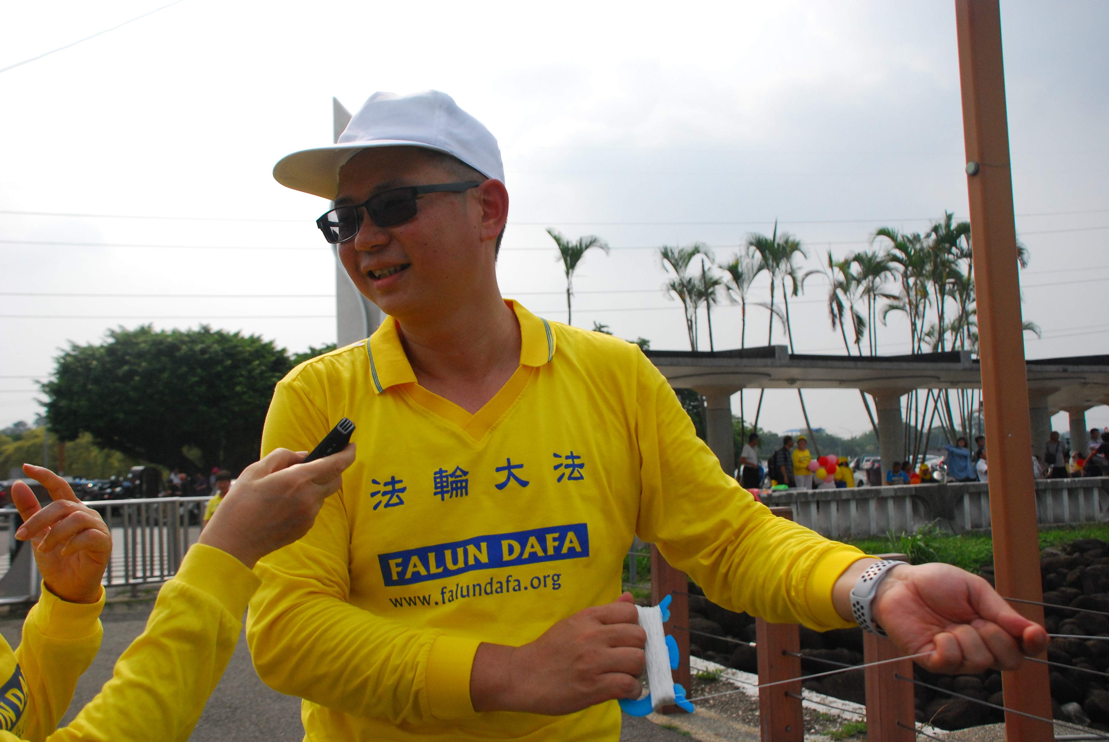 图13:常年在仁义潭讲真相的学员蔡雪峰今天兴奋的参加法轮大法日活动,祝师父生日快乐。