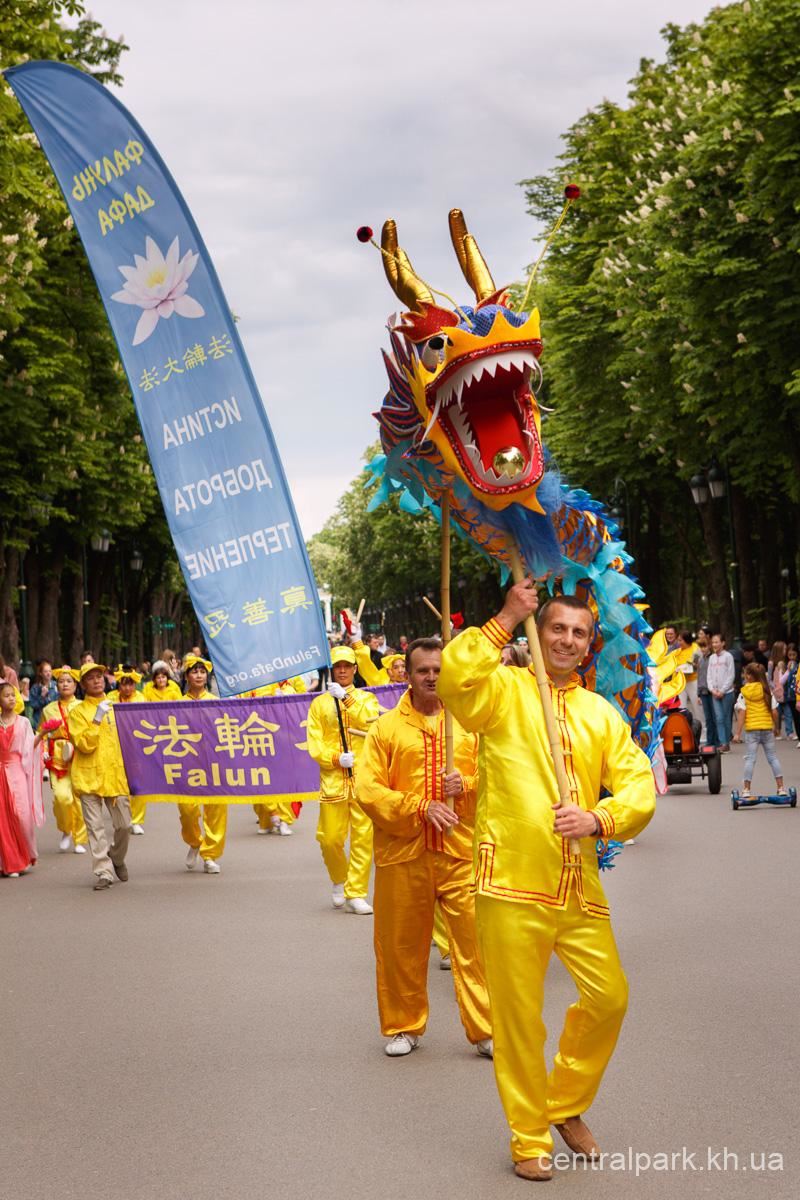 五月十二日,首都基辅市法轮功学员也以舞龙、腰鼓、演炼功法等,与市民及游客共度美好节日。