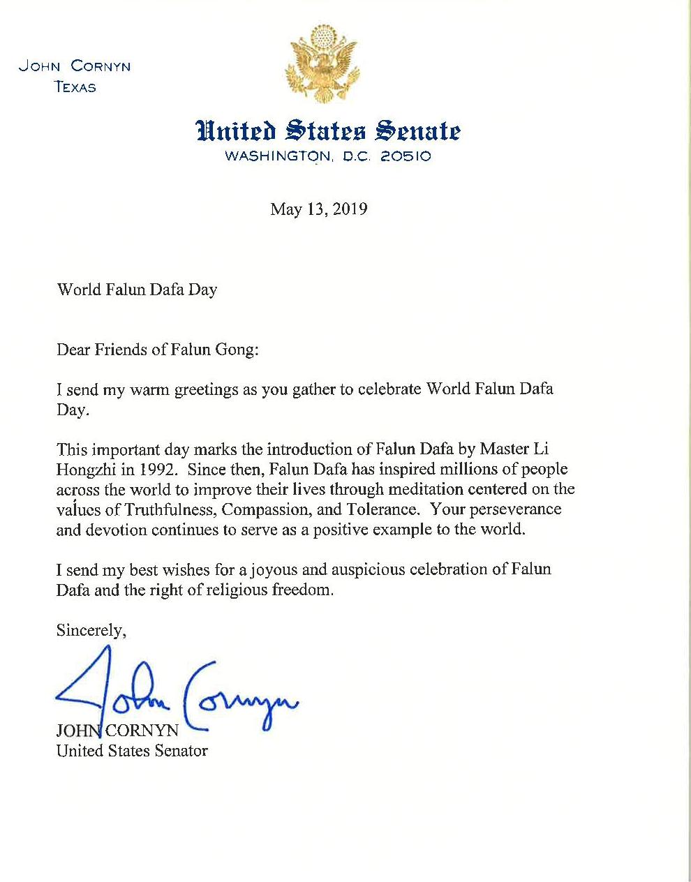 德州联邦参议员约翰·科恩的贺信