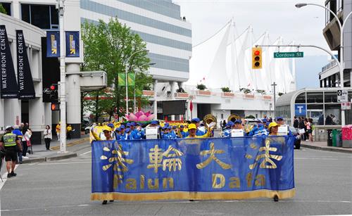 5月12日周日,温哥华气温凉爽,市中心有很多休闲的市民和游客。法轮功学员的游行队伍由天国乐团,横幅队,“真善忍”花车,法轮功功法演示队,腰鼓队等组成。大批民众拍摄游行场面,或与队伍合影,有行人向法轮功游行队伍挥手致意,或举出胜利的手势,还有人向游行队伍双手合十并弯腰致意。市民纷纷赞叹“太好了”,“真美呀”,“让我好好享受这一刻”。很多行人接受了法轮功资料后,立即询问在哪里可以学习功法。很多华人纷纷拍摄游行场面。也有西人电视台记者到现场拍摄。