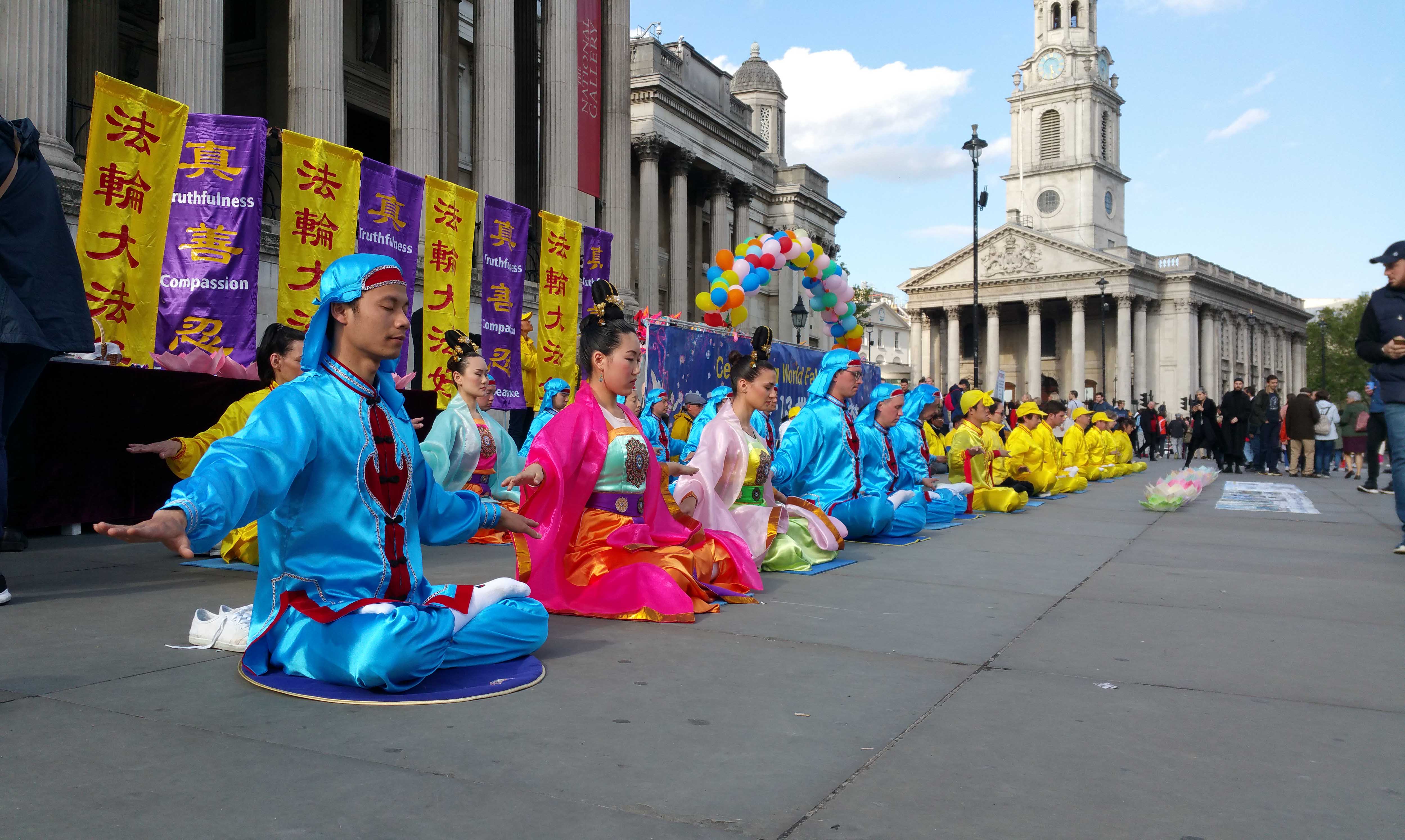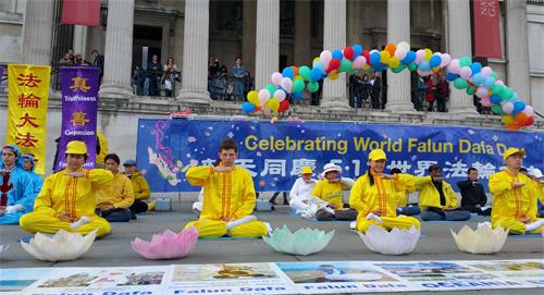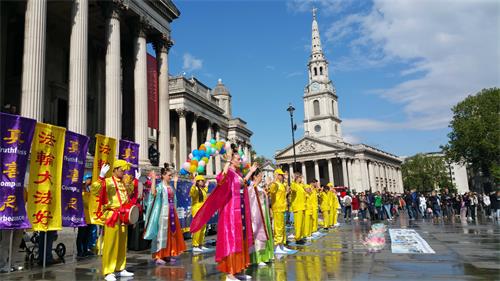 图1~3:二零一九年五月十一日,在伦敦特拉法加广场北台阶,法轮功学员展示法轮功五套功法、打腰鼓、舞龙,满怀喜悦和感恩庆祝“世界法轮大法日”.