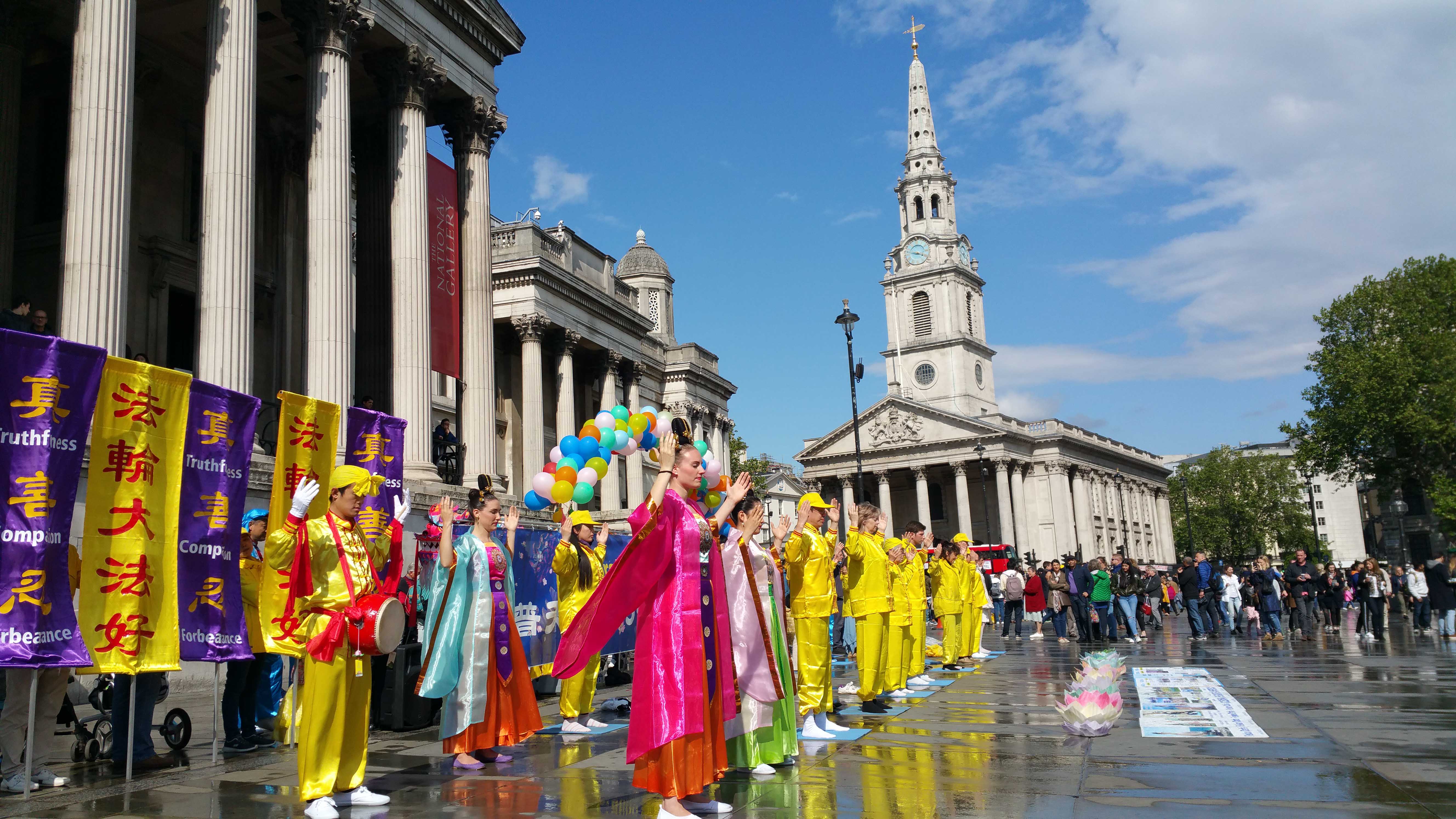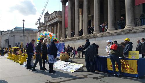 【明慧网二零一九年五月十五日】(明慧英国记者站报道)二零一九年五月十一日,英国法轮功学员在伦敦市中心特拉法加广场(Trafalgar Square)举行活动,恭贺第二十届“世界法轮大法日”和法轮功创始人李洪志先生华诞,学员们满怀喜悦和感恩展示传播法轮功真相、同颂法轮大法的美好,感恩师父的慈悲救度与保护,感恩师父把“真、善、忍”带给全世界;英国民众和来自世界各地游客看到真相后齐赞“真善忍”,坚决反对中共迫害法轮功;很多华人带着不无惊喜的表情观看法轮功学员的庆祝活动,有中国大陆人现场“三退”保平安。