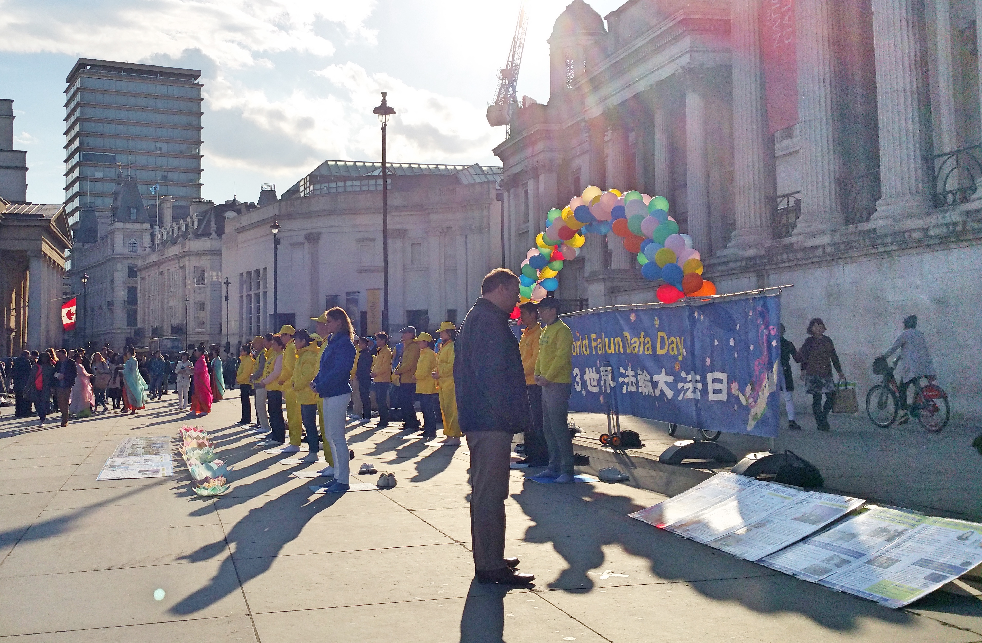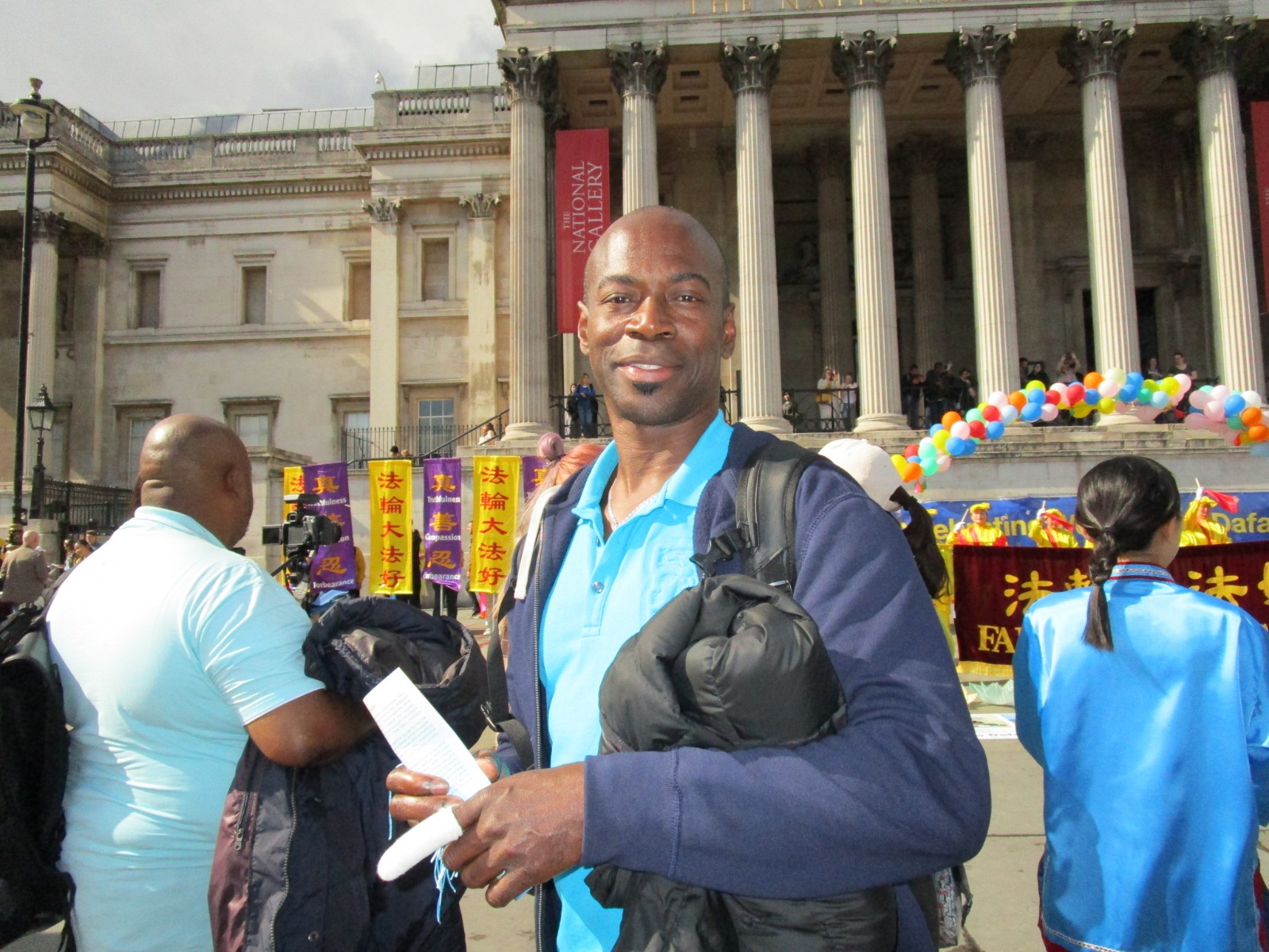 约瑟夫(Joseph)从事木匠工作,五月十一日他从教堂出来,远远看见特拉法加广场这边鲜明黄色衣服的人群,马上走过来看个究竟。他说他第一次看到法轮功,他认真观看法轮功学员的功法展示,仔细阅读每块真相展板。约瑟夫体会到法轮功的平和能量,说到法轮大法指导学员遵循“真、善、忍”修炼,约瑟夫感悟:“这是很正的途径,对全人类的福祉有帮助”。他表示回家后要去进一步了解法轮大法。