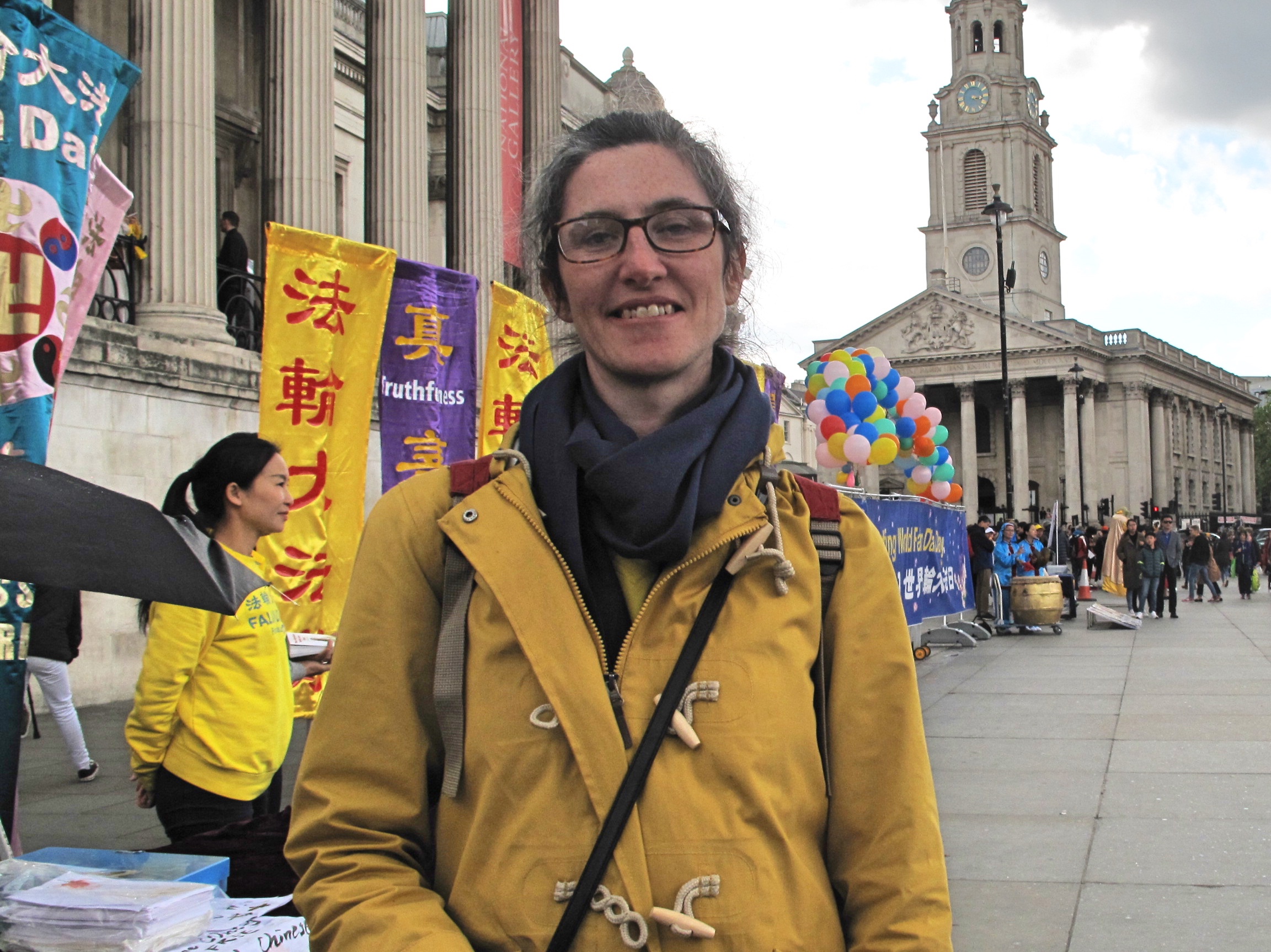 凯特(Kat)是家住康沃尔的法轮功学员,五月十一日,她在凌晨一点搭七个小时汽车来伦敦参加英国法轮功学员庆祝世界法轮大法日的活动,她直接来到中使馆前的法轮功学员二十四小时和平抗议点,与在那里的学员一起炼功。接着,她参加了法轮功学员的盛大游行和集会。在游行中,她打着一个“法轮大法好”金色条幅走在游行队伍前列,凯特希望一路上遇到的人能听到自己的心声:“我想让大家了解法轮大法是什么,法轮大法的基本原则(真善忍),希望他们知道在中国发生的(中共对法轮功的)迫害。”