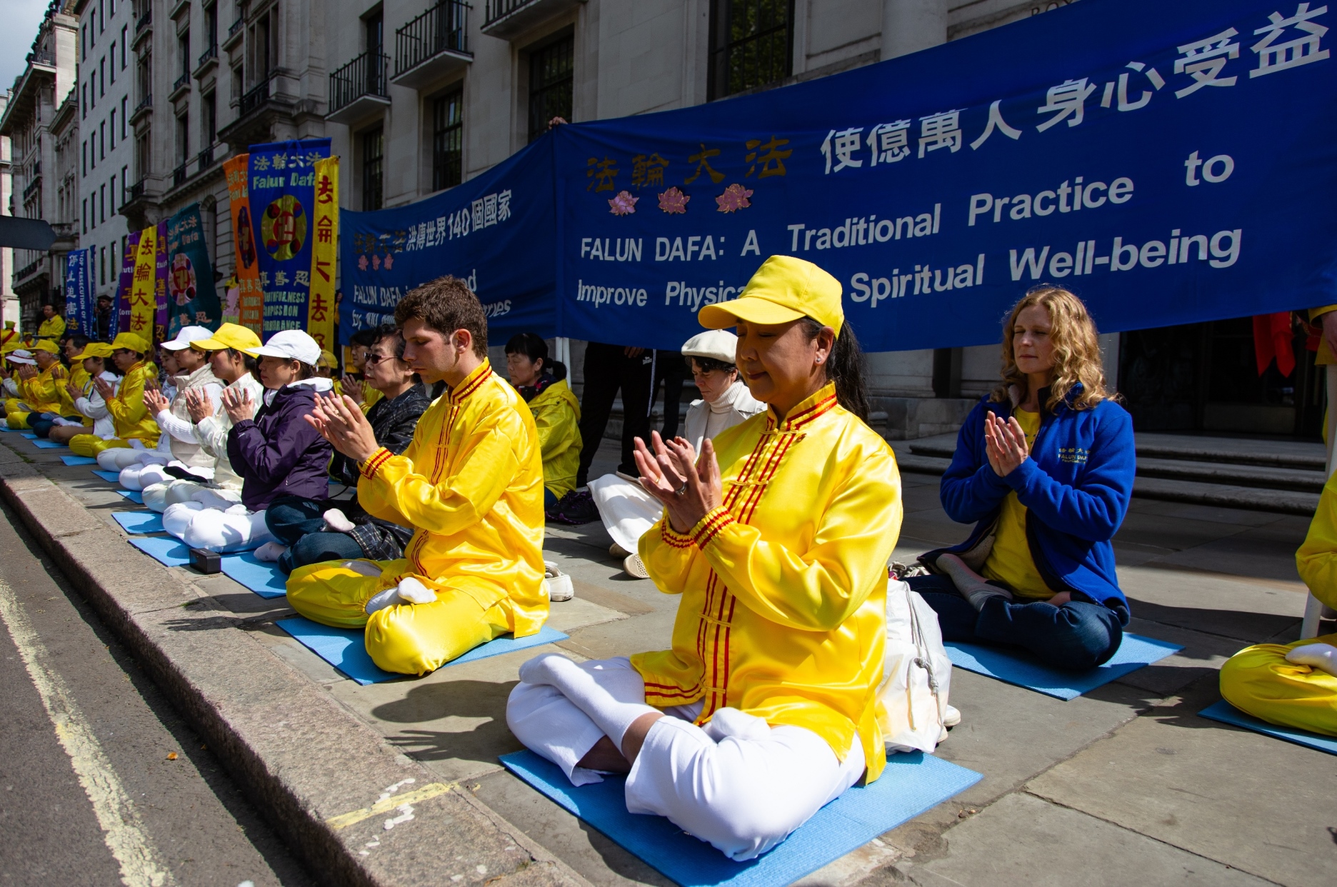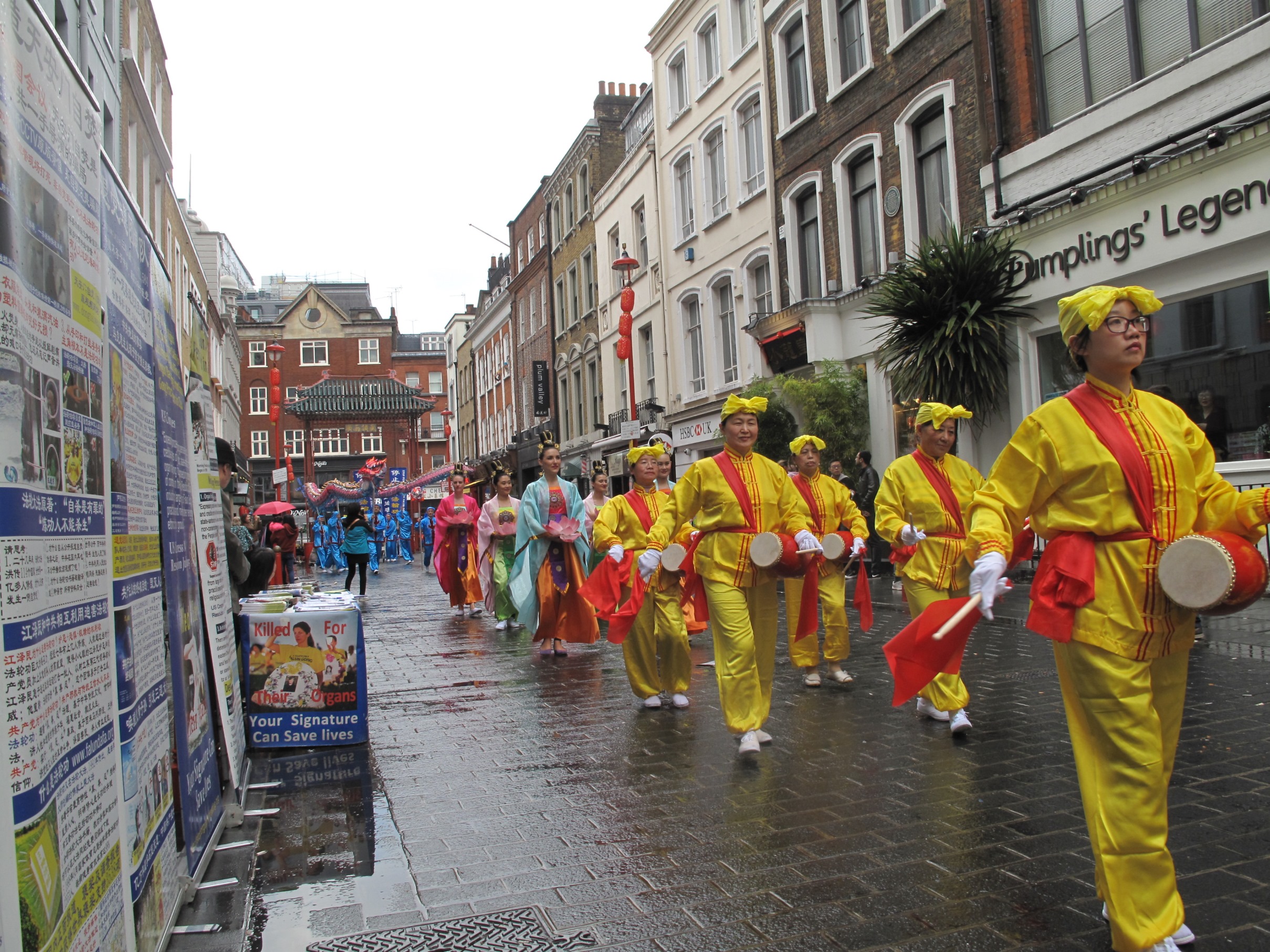五月十一日晨,部分英国法轮功学员在伦敦中共使馆前进行集体炼功、发正念,抗议迫害。中午十一点半,法轮功学员的游行队伍从中共使馆前出发,途径伦敦市中心繁华的商业街、唐人街,历时约两个小时,抵达国家美术馆前的鸽子广场北平台。