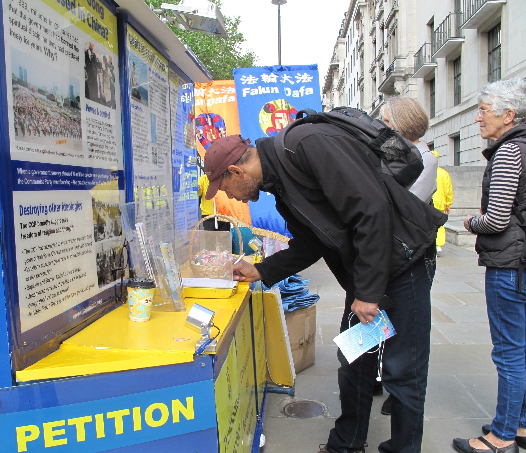 他赞美法轮功学员在展示光明,把美好带到伦敦中心,“真善忍”是普世价值,是真理,应该让每个人知道并反对中共迫害法轮功。他接着在法轮功学员面对中共使馆二十四小时和平抗议的真相展位上签名,支持反迫害,还向另外两位驻足观看的路人介绍法轮功真相。