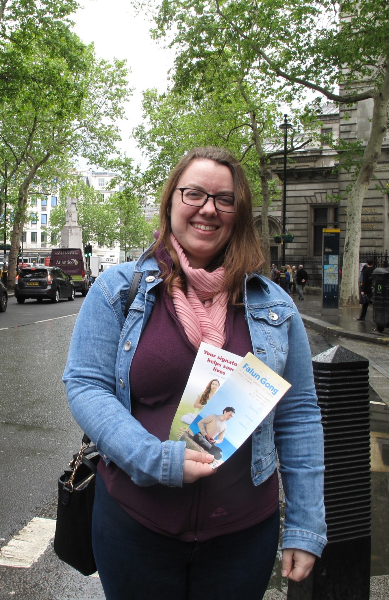 在伦敦一家银行做顾问的路易丝(Luise)两周前刚从爱尔兰的一个小城市搬过来,五月十一日这天有幸在路上遇到庆祝世界法轮大法日的法轮功游行队伍。这是她第一次看到法轮功,立即被吸引住了,拿出手机录视频,她被法轮功学员展示传递的真相信息所震撼,游行队伍经过之后她站在街头专心阅读真相传单。