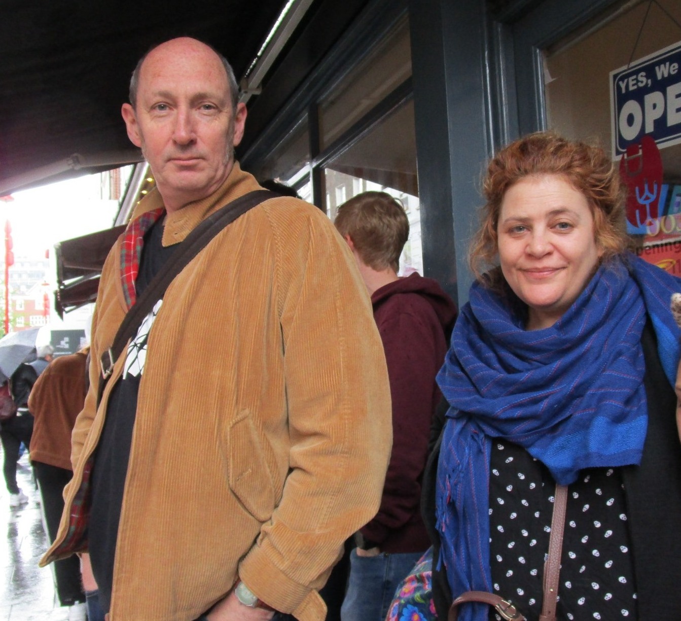 图11:英国人杰米.安德森(Jamie Anderson)一边观看游行,一边向同伴哈瑞森(Harreson)女士讲中共强摘法轮功学员器官的恶行。