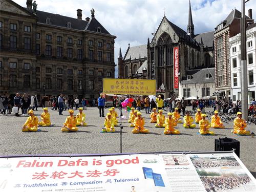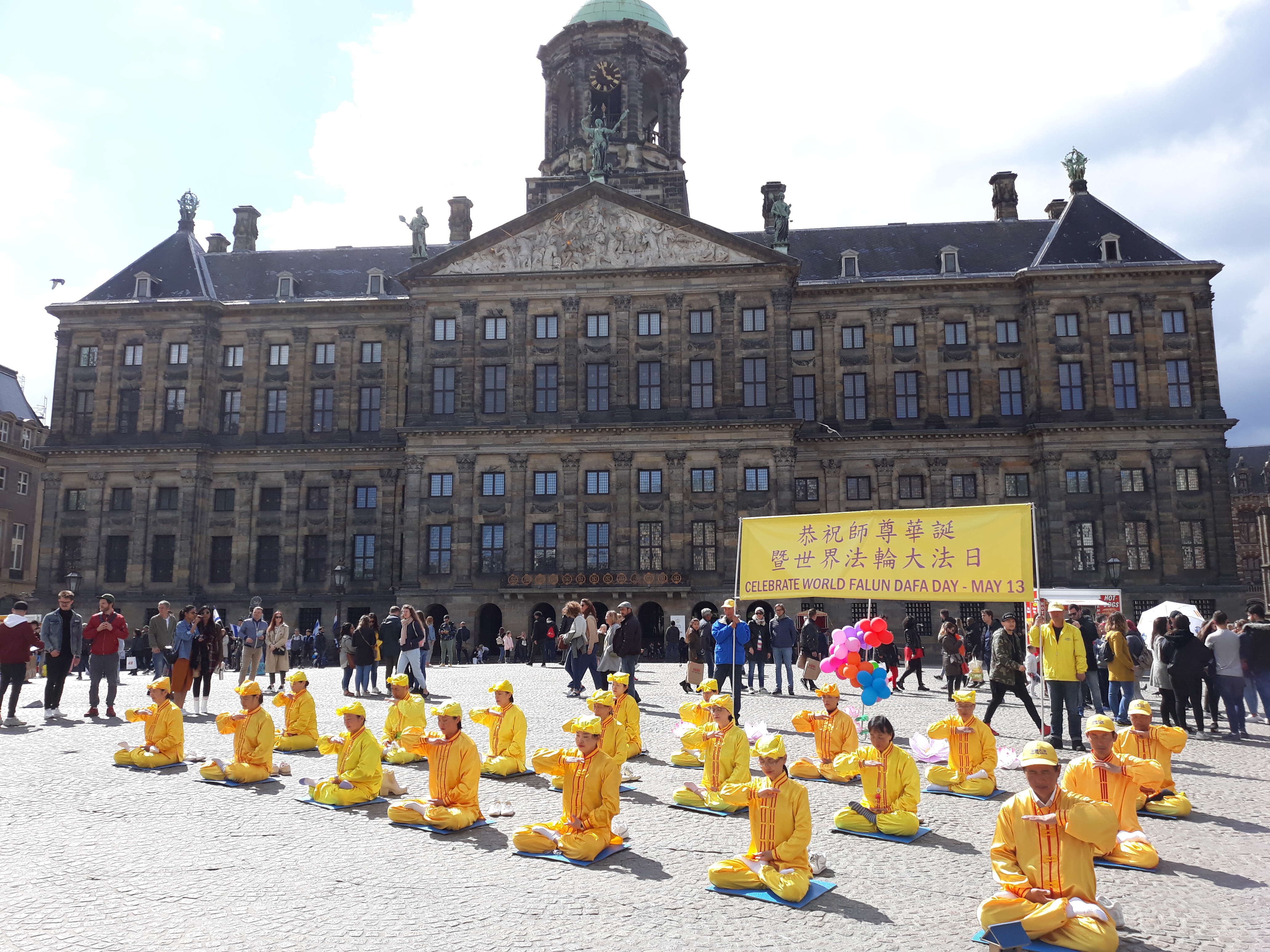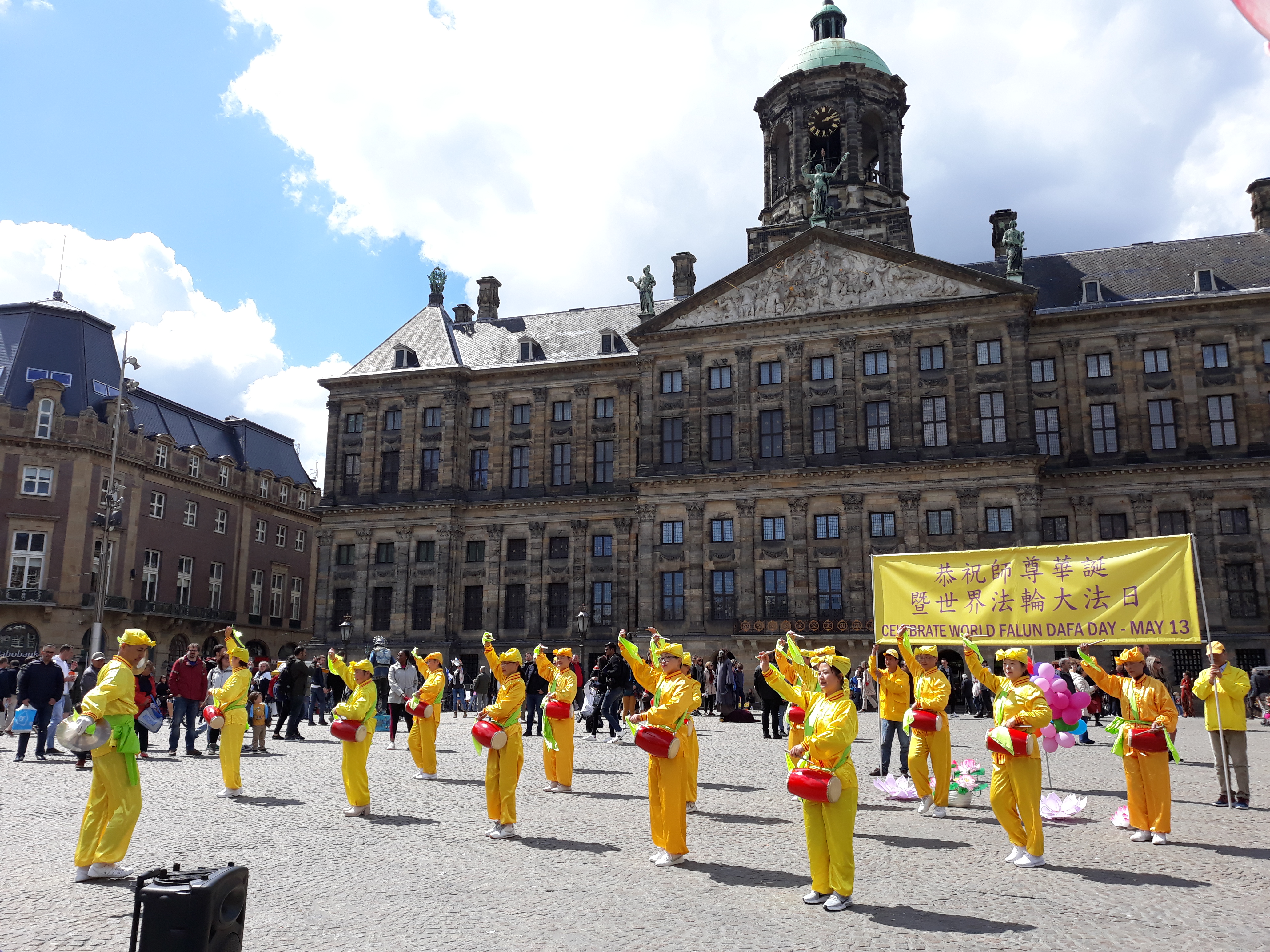 【明慧网二零一九年五月十五日】2019年5月12日,多雨的荷兰天气格外晴朗,首都阿姆斯特丹(Amsterdam)著名的旅游胜地达姆(Dam)广场游客云集。忽然传来一阵欢庆的锣鼓,吸引了很多游人的目光,原来是荷兰法轮功学员在此举行活动,庆祝世界法轮大法日。