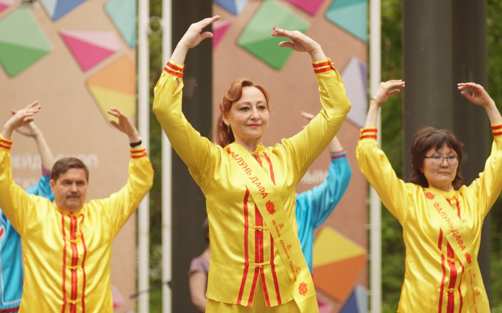 看到法轮功学员在台上展示功法动作,让很多人很感兴趣,当场就学炼起来。一位女士第一次看到说:“我对功法非常感兴趣,甚至尝试了一下跟他们一起炼,对人显然非常有益。”