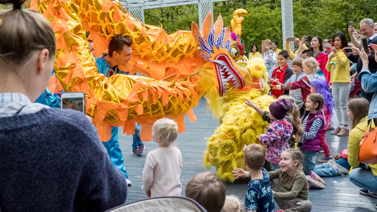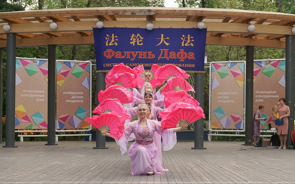 游行过后,回到公园的舞台上“腰鼓队”的表演首先拉开了帷幕。而后主持人介绍到“法轮大法或法轮功是一种起源于中国的修炼功法,蕴含了这个古老国家丰富的文化遗产。因为其祛病健身的奇效和浅显易懂的修炼原理,法轮功迅速传遍中国,而后是全球。今天在一百一十四个国家,有一亿人在修炼法轮功。”主持人接着说,“今天我们聚集在一起向大家介绍一下中国传统,这些传统在很多方面与人的修炼有关并向大家介绍法轮功。下一个舞蹈叫做法轮大法好!”而后还表演了“白莲”、“新疆舞”、“优昙婆罗花”、“扇子舞”、“雨伞舞”等让观众叫好连连。舞台旁边设有桌椅板凳,现场教小朋友们折叠纸莲花。