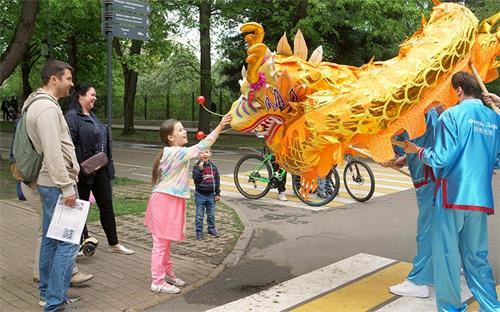 下午三点,法轮功学员的游行队伍开始缓缓行进,游行队伍由“仙女队”、“功法展示方阵”、“唐装队”、“舞龙队”、“腰鼓队”和“舞狮队”组成。沿着公园的主干道,伴随着“法轮大法好”的音乐徐徐行进,游人纷纷拿出手机等拍照录像。很多人收到了印有:“法轮大法好”和“真、善、忍”字样的小莲花,感到非常地高兴,接到信息传单后仔细阅读。