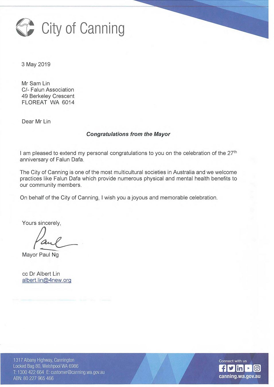 ![]() 图4:坎宁市(City of Canning)市市长保罗·黄(Paul Ng)给西澳法轮大法学会发来贺信 |