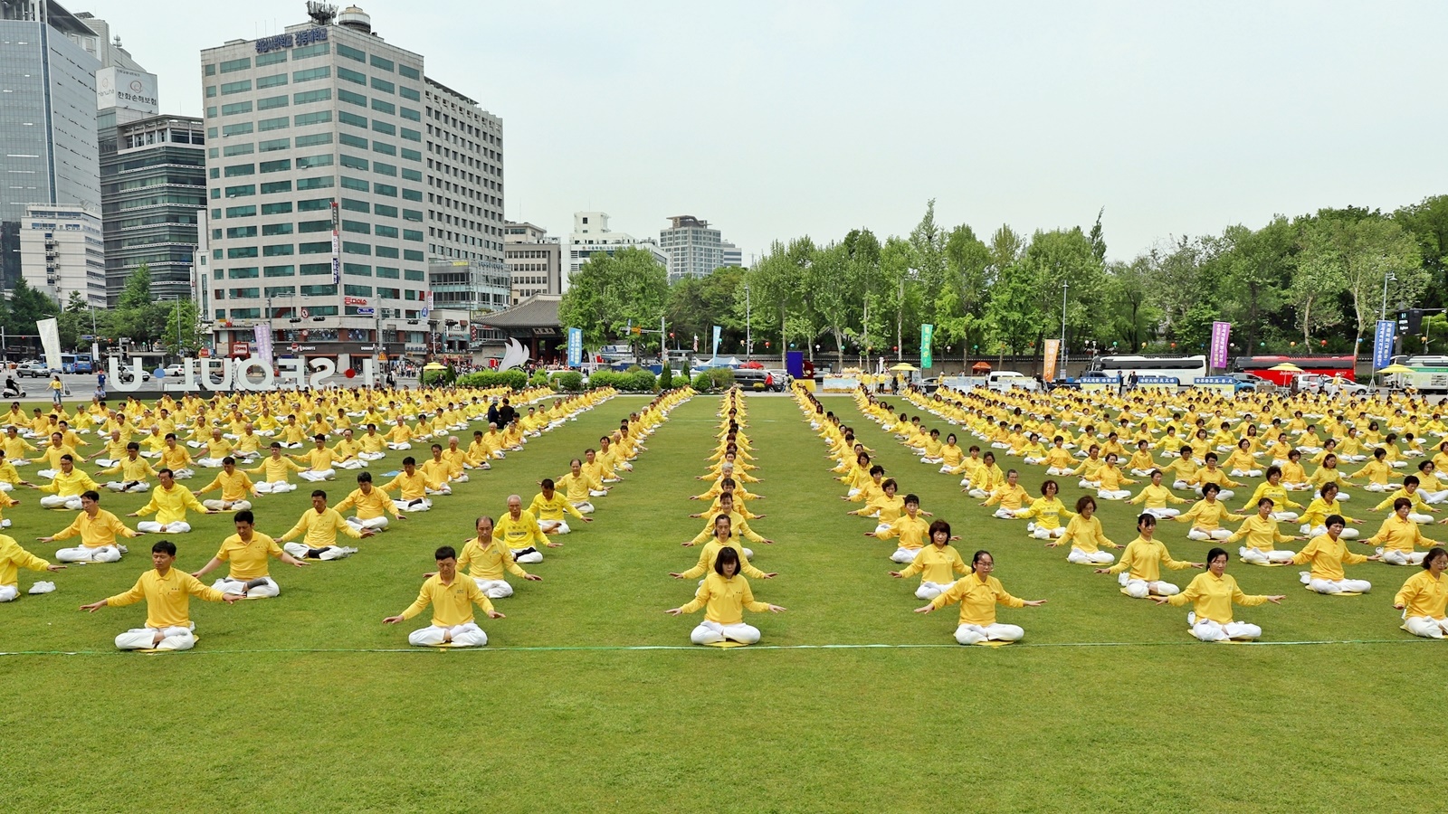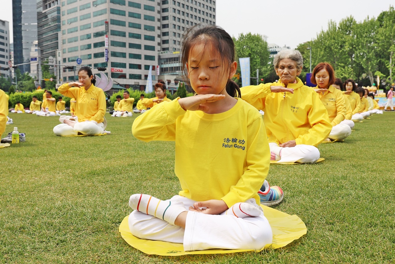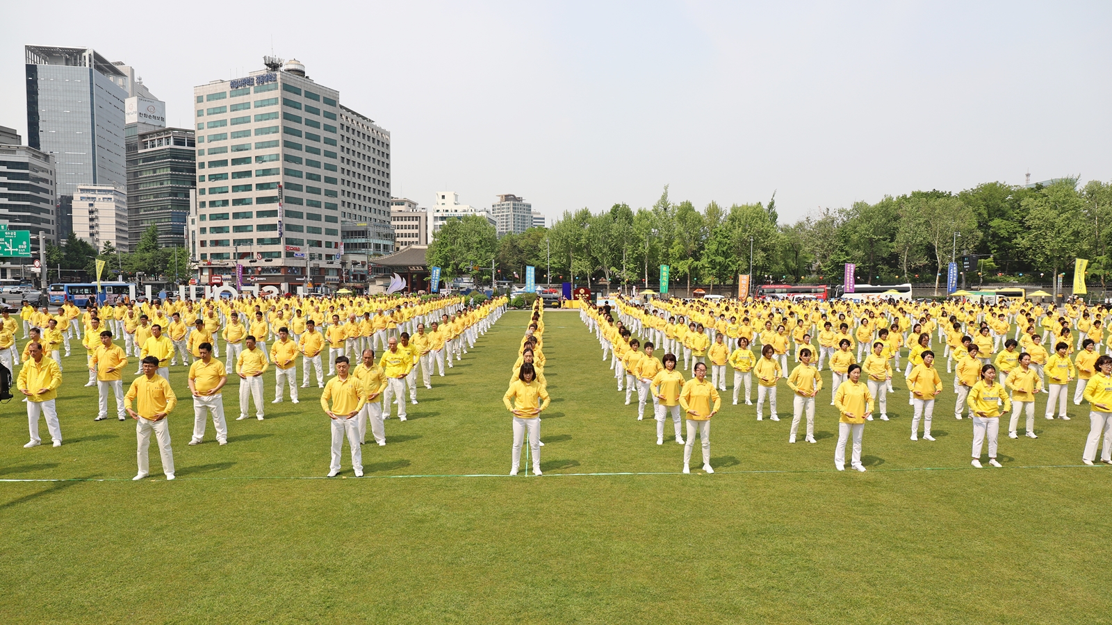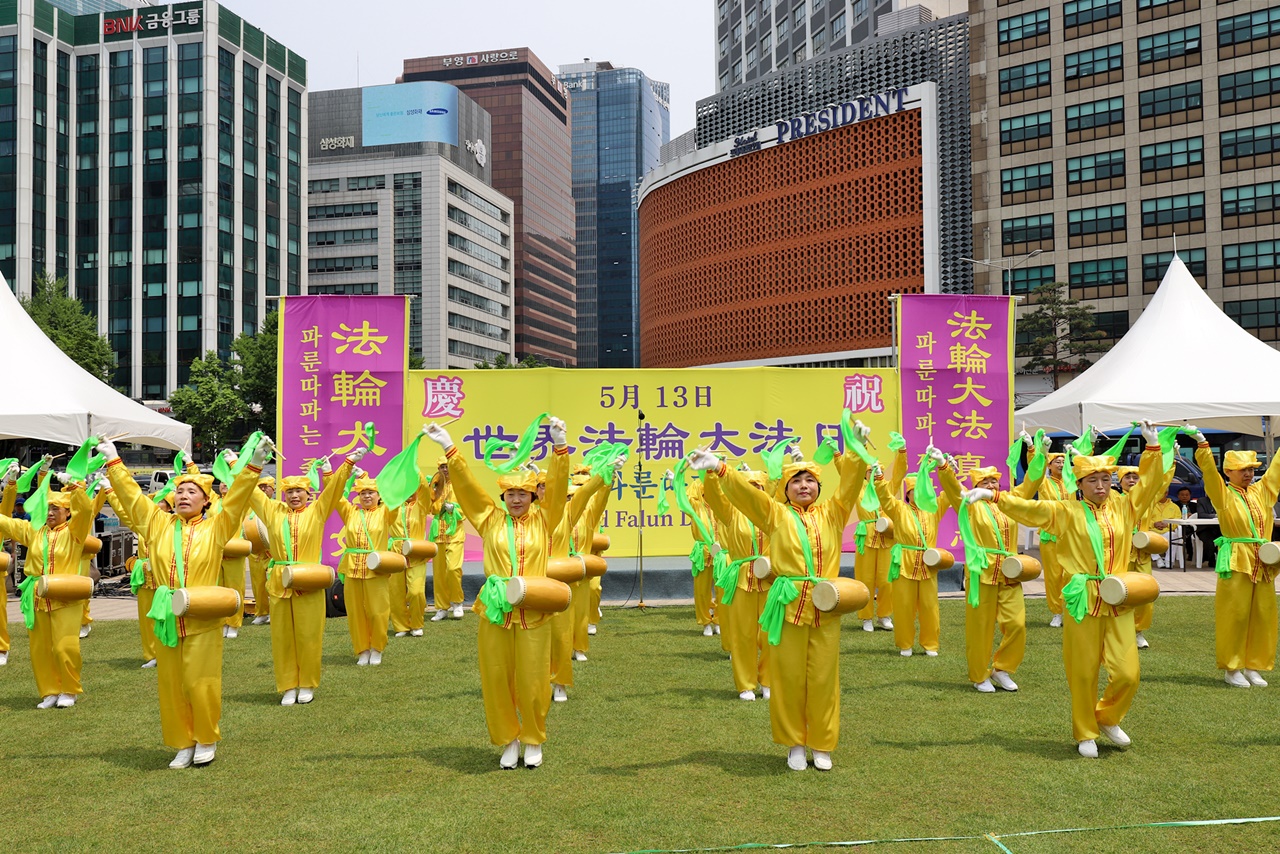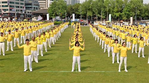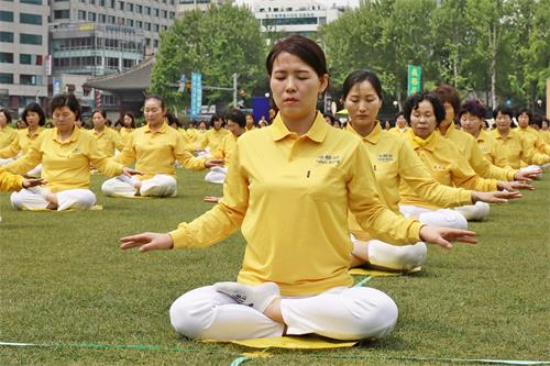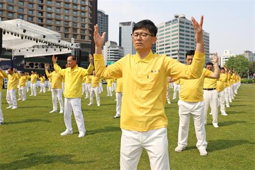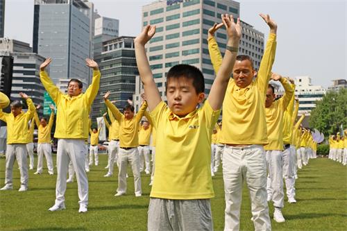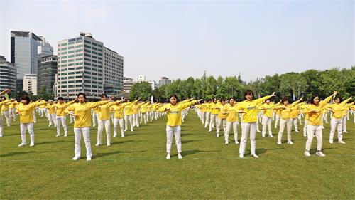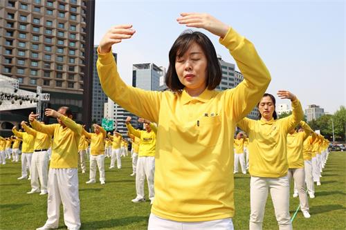 当天上午九点三十分,法轮功学员在首尔广场演示五套功法,拉开了庆祝“世界法轮大法日”的序幕。优美祥和的炼功音乐飘荡在广场上空,舒缓柔和的炼功动作展现了法轮大法的美好与殊胜,吸引了现场民众咨询并学炼功法。