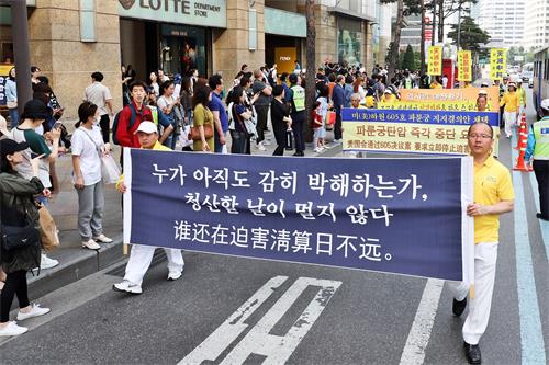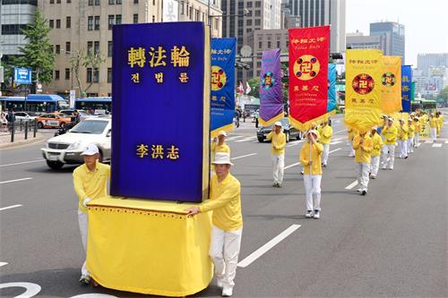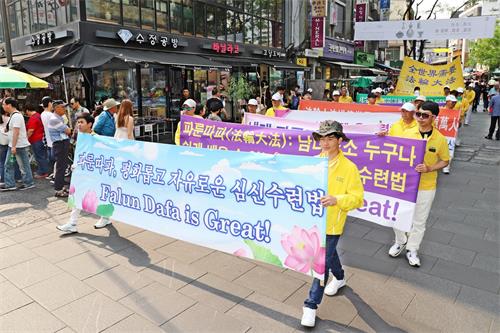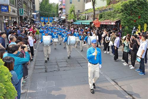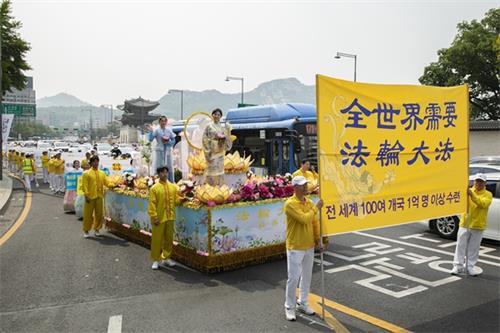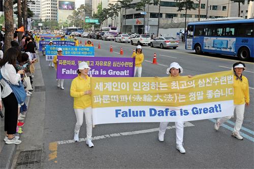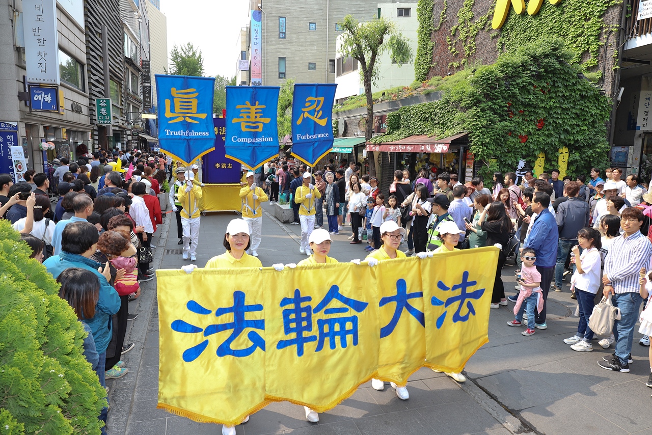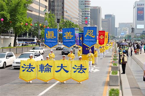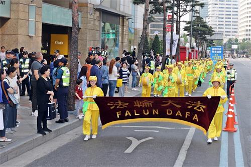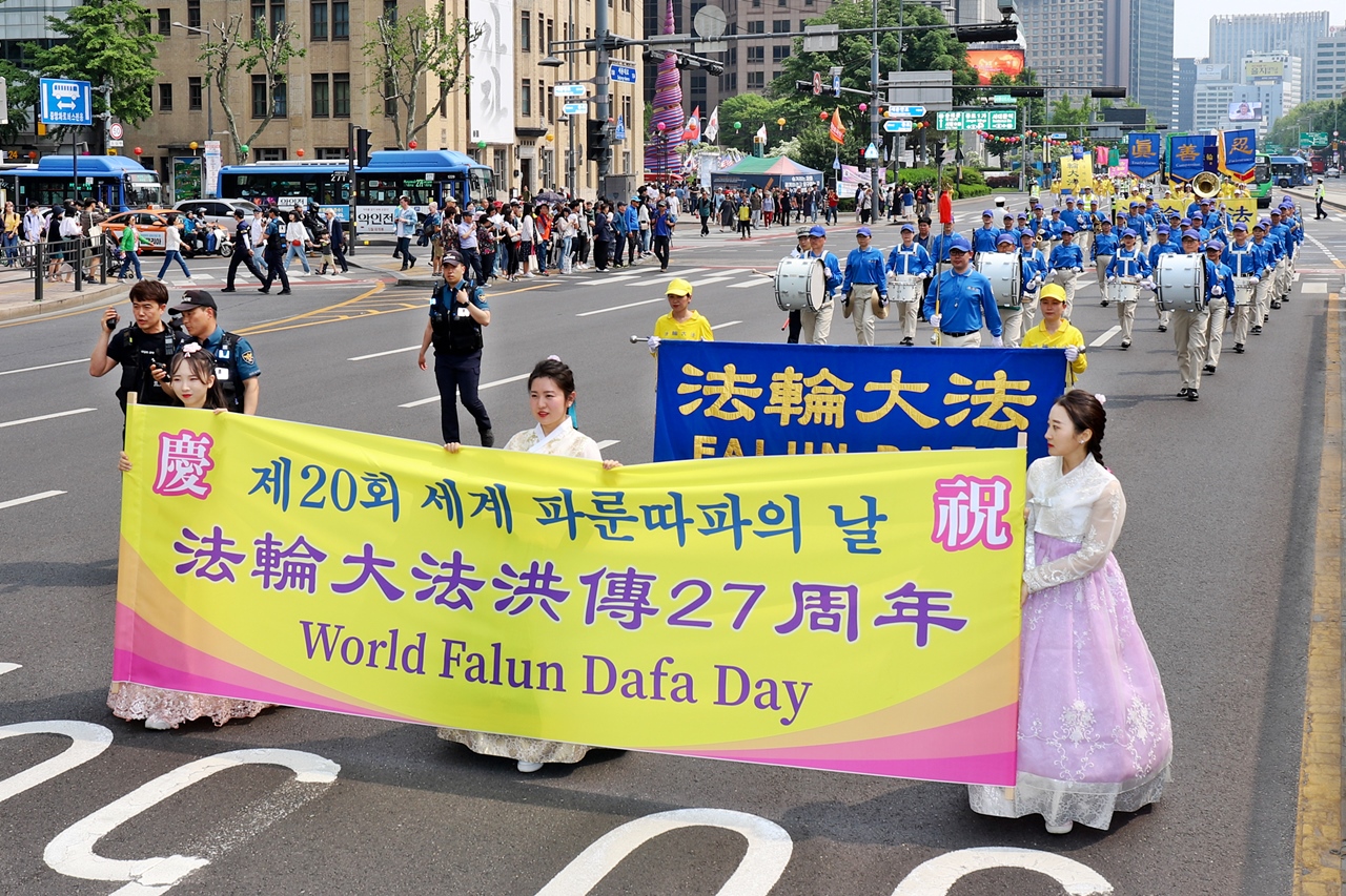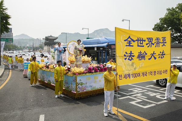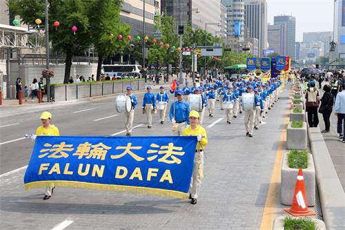身穿华丽韩服的三名女学员打出“庆祝法轮大法洪传27周年”的横幅,紧接着是在游行队伍中打头阵的天国乐团;“法轮大法”大型横幅、花车、炼功演示队伍、腰鼓队跟随其后,参加游行行列的法轮功学员们各手举横幅向路人展示大法的美好、要求停止迫害,整个游行队伍壮观而宏大,吸引了无数行人驻足观看和赞叹。