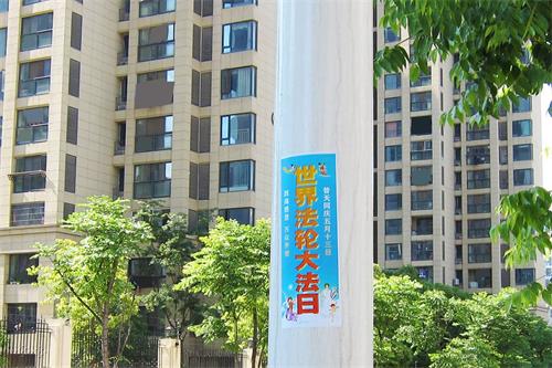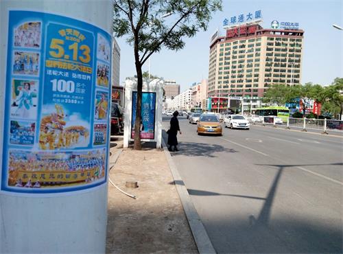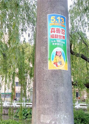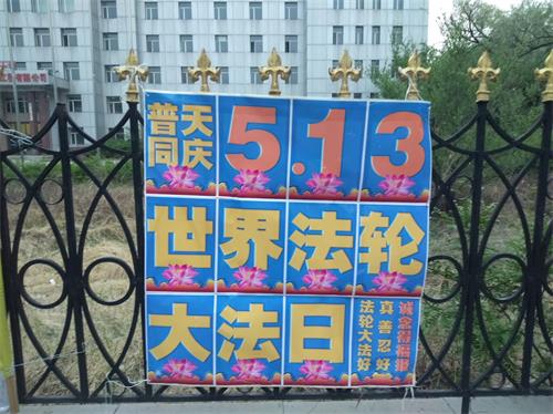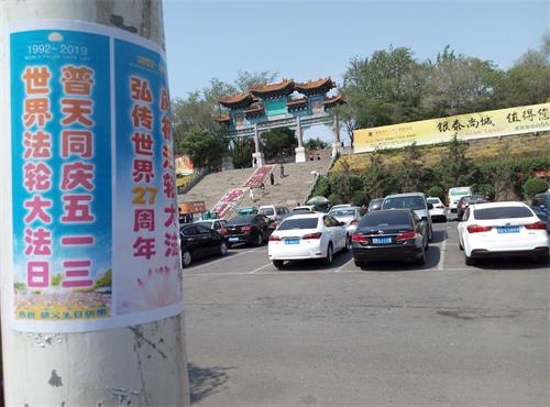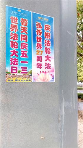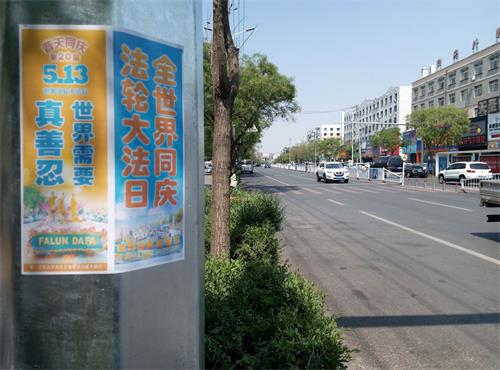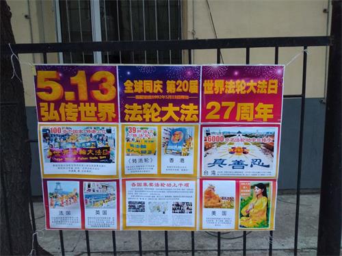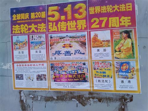 近日,辽宁省铁岭市法轮功学员以粘贴图片的形式给世人,庆祝2019年世界法轮大法日(5月13日)。