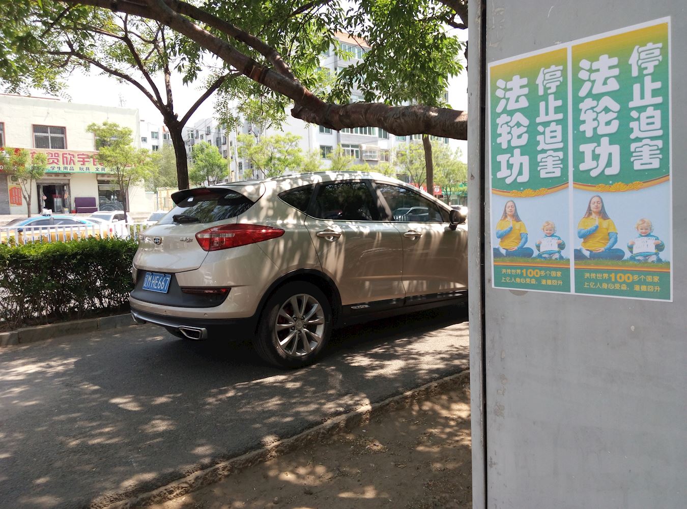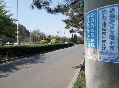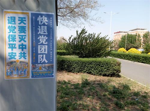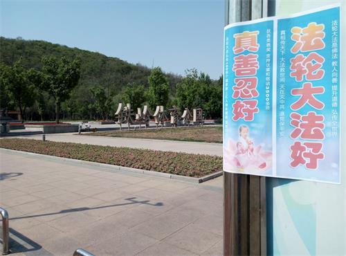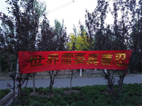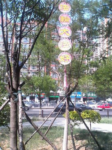 在街道两边公园绿地等处,有“普天同庆第20届世界法轮大法日、世界需要真善忍、停止法轮功、法轮大法弘传世界100多个国家、真善忍福益众生、快退党团队保平安、法轮大法好、真善忍好”等等粘贴,告诉广大民众法轮大法好的真相。