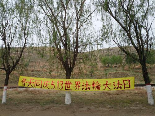 庆祝世界法轮大法日,河北张家口市乡村悬挂的横幅及粘贴的展板