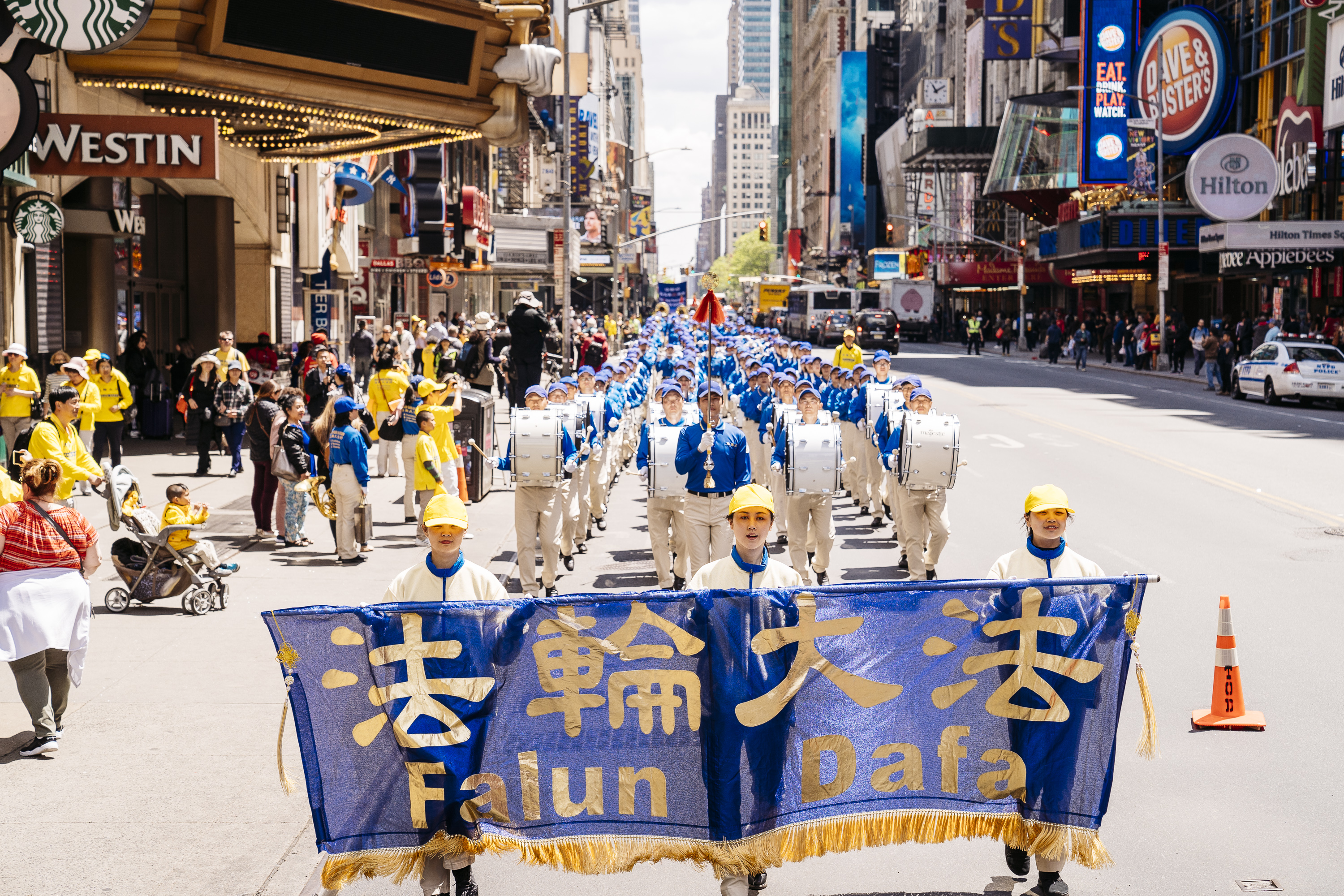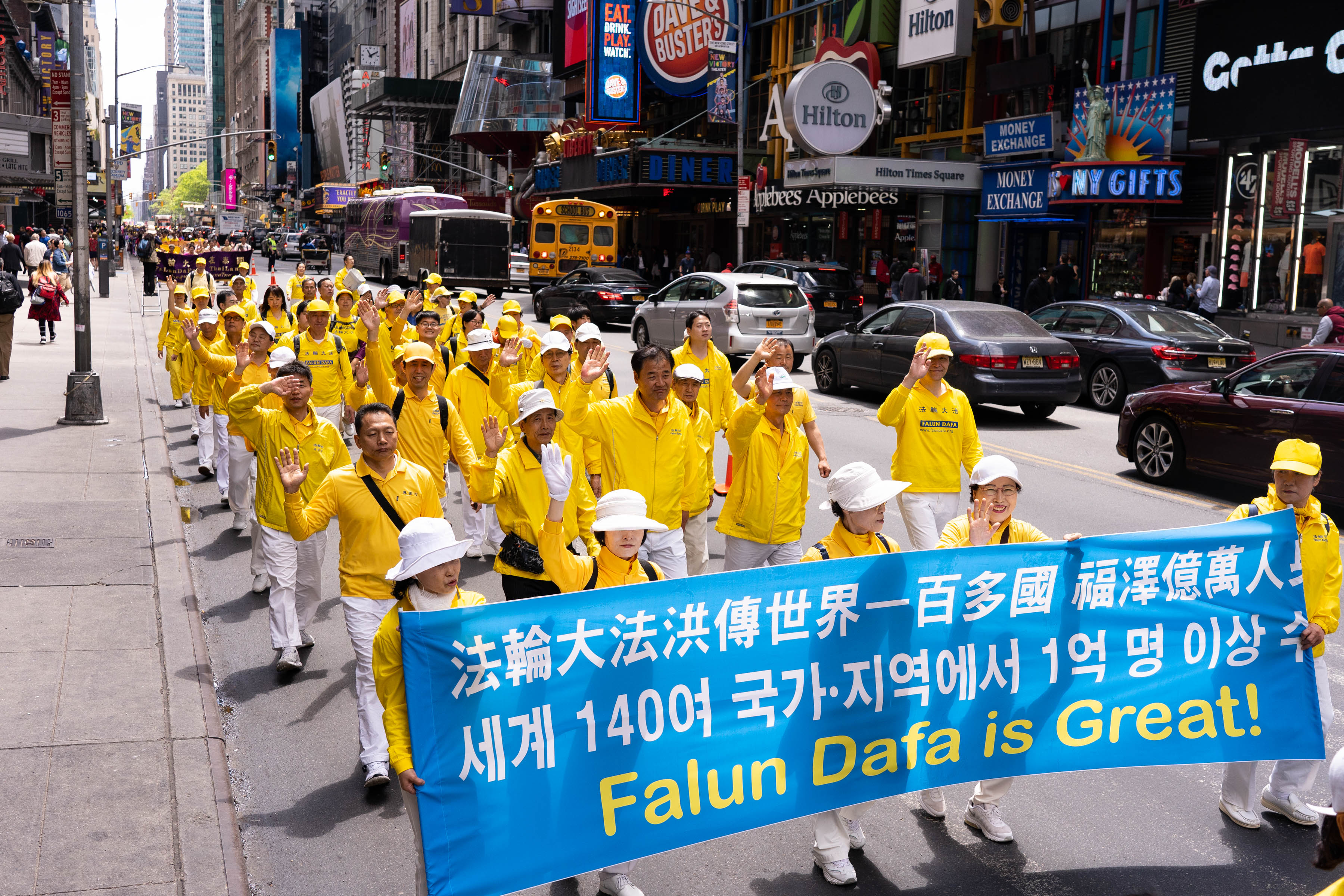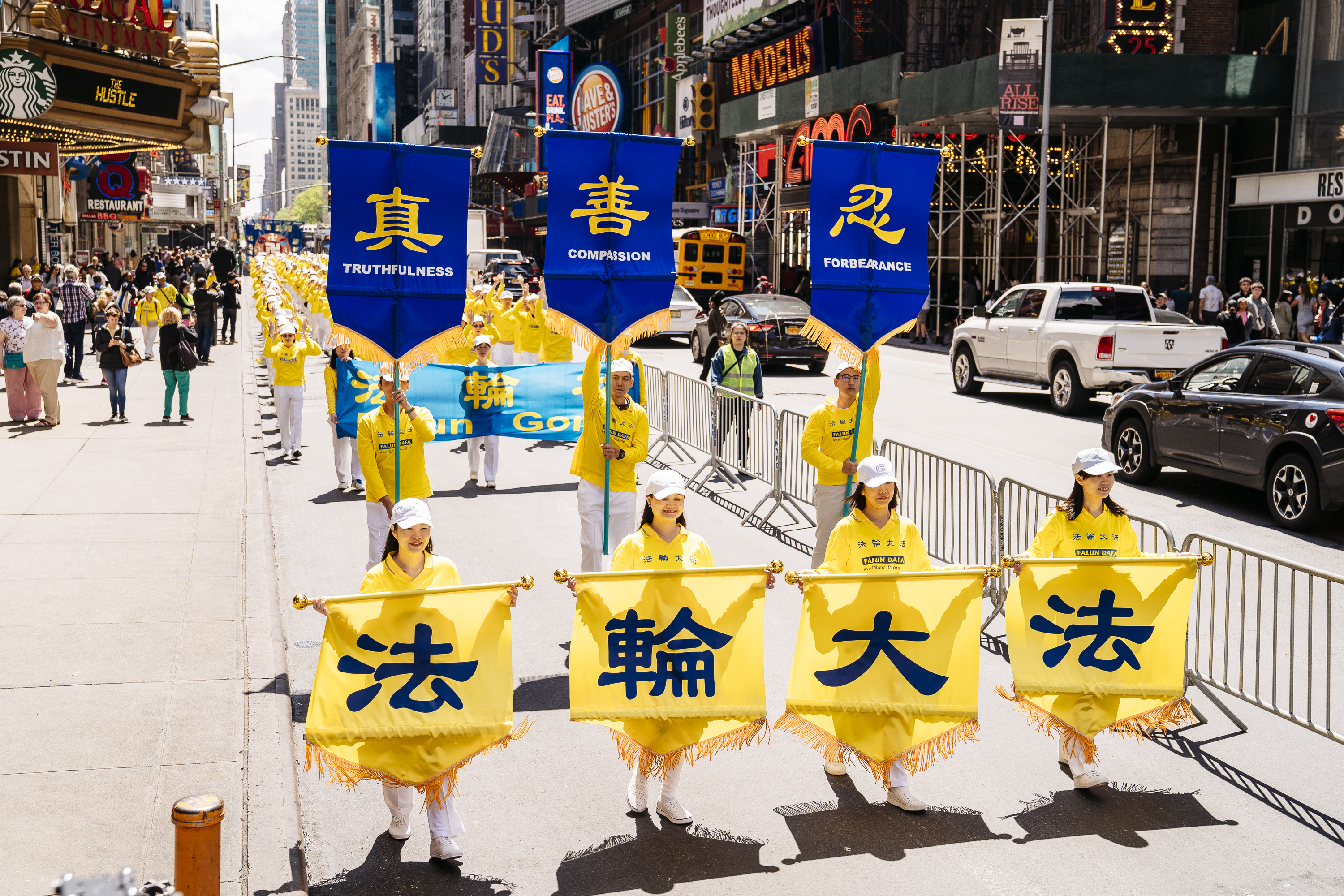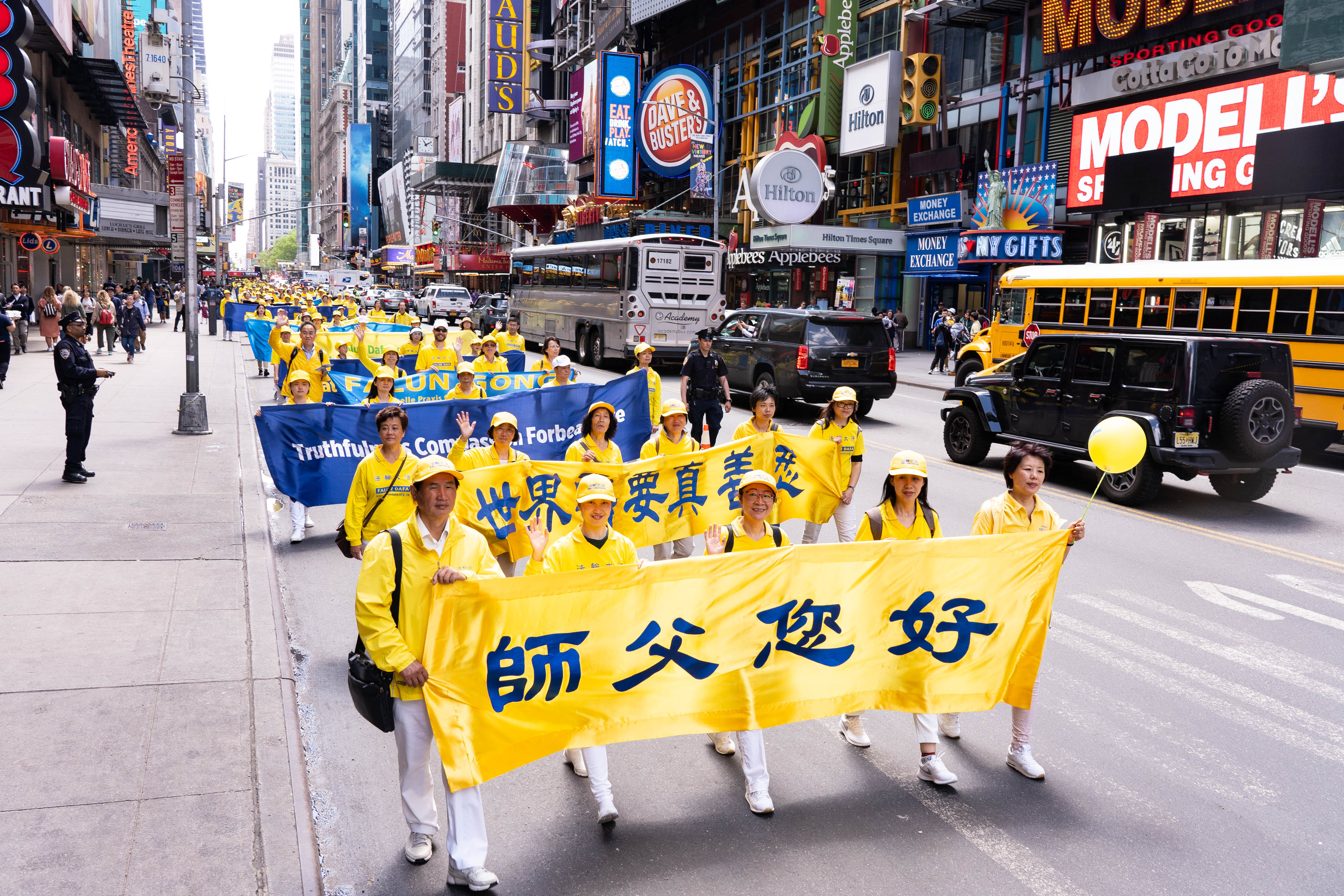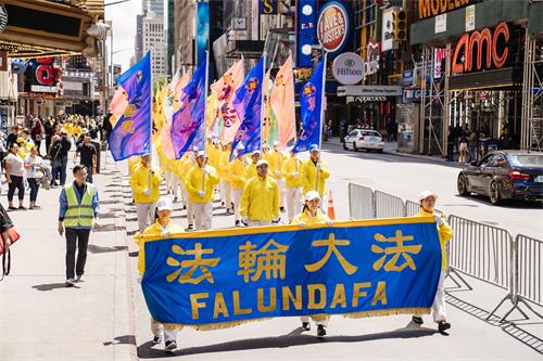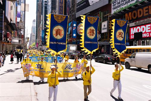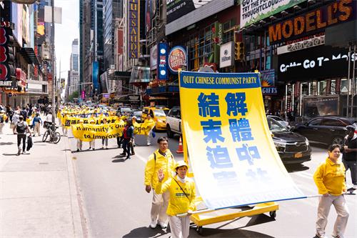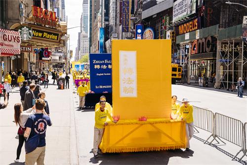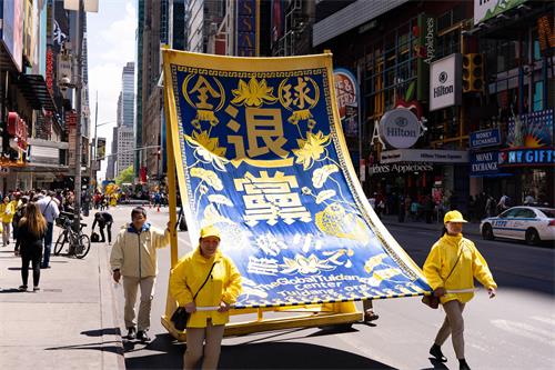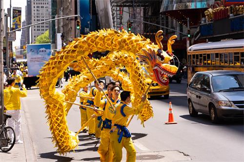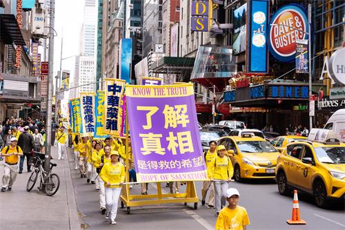 浩浩荡荡的游行队伍震撼着整个曼哈顿中心。从天国乐团演奏的雄壮行进军乐、深具中国传统特色的腰鼓表演,到身着华丽民族服饰的世界各国法轮功学员、缤纷多姿的花车、灿如花海的各色彩旗条幅、法轮功功法演示等,吸引着人们纷纷从办公楼出来观看,有表示支持的,有赞叹美好的,有询问详细信息的,有表示要学炼法轮功的,还有不少现场明真相后做了三退(退出中共党团队,简称三退)的华人。