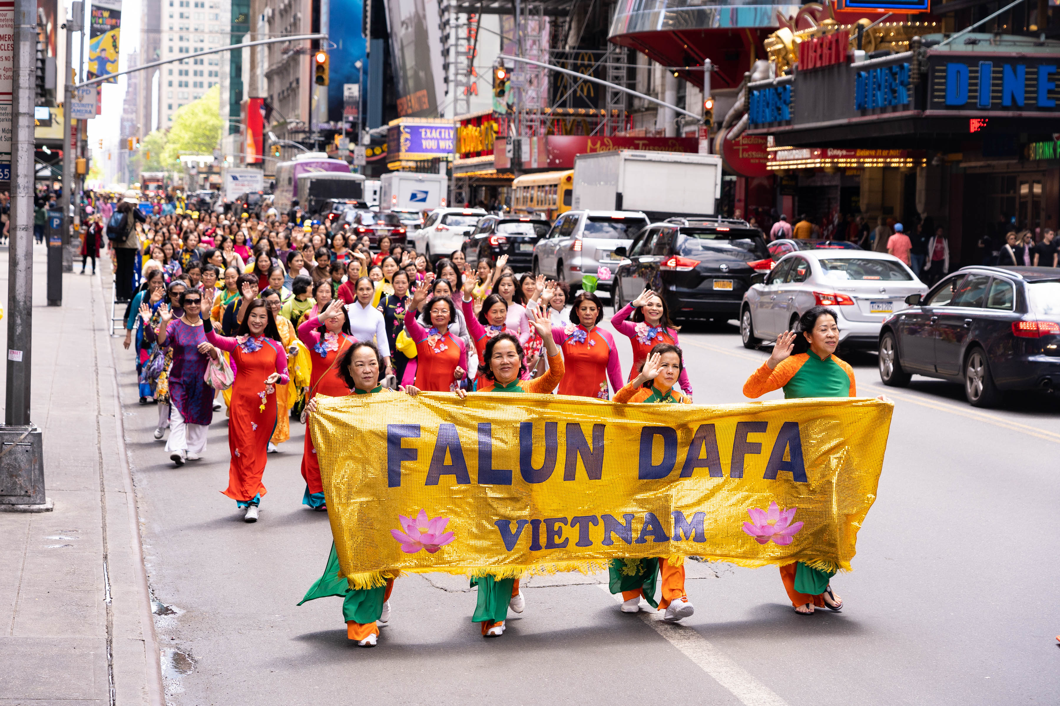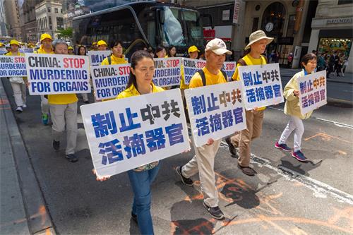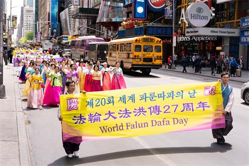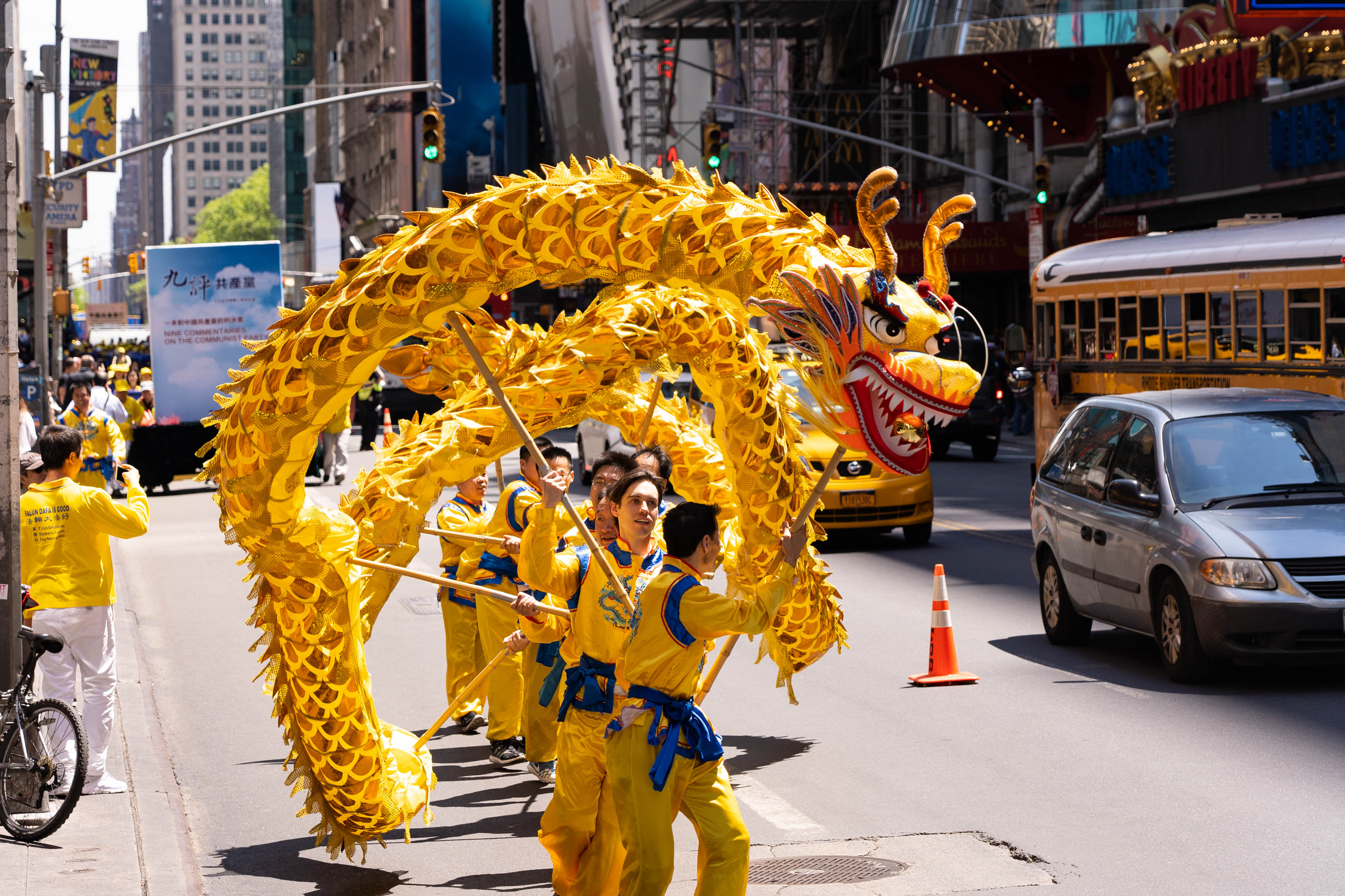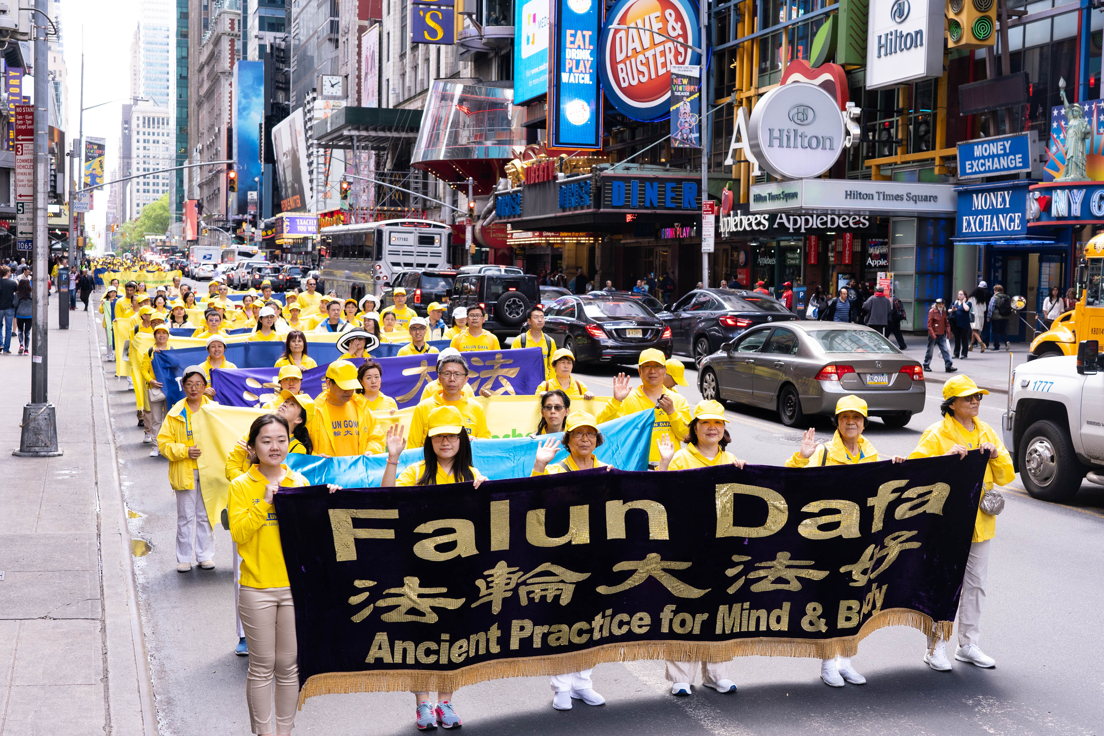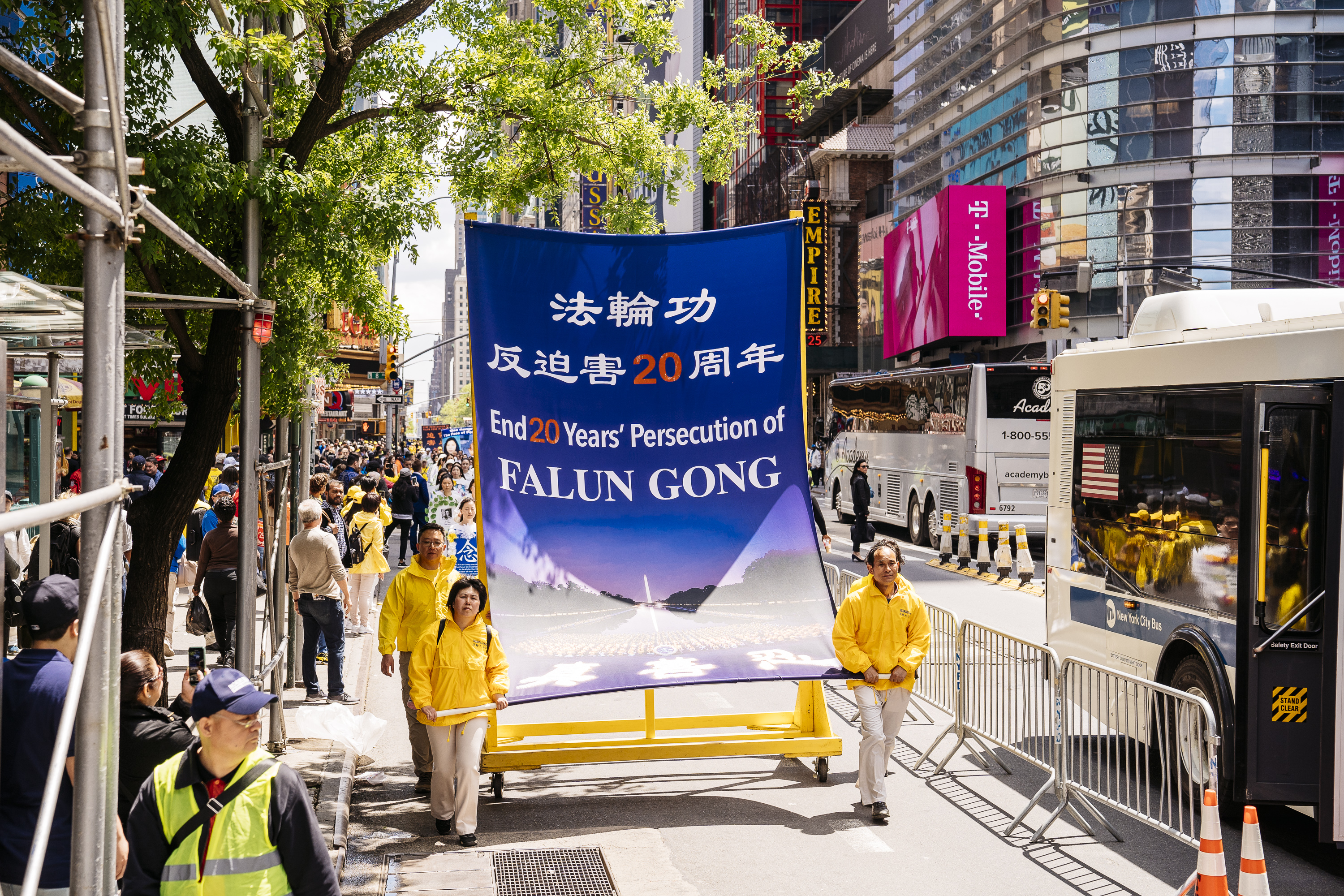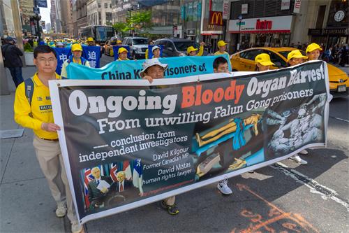 浩浩荡荡的游行队伍震撼着整个曼哈顿中心。从天国乐团演奏的雄壮行进军乐、深具中国传统特色的腰鼓表演,到身着华丽民族服饰的世界各国法轮功学员、缤纷多姿的花车、灿如花海的各色彩旗条幅、法轮功功法演示等,吸引着人们纷纷从办公楼出来观看,有表示支持的,有赞叹美好的,有询问详细信息的,有表示要学炼法轮功的,还有不少现场明真相后做了三退(退出中共党团队,简称三退)的华人。