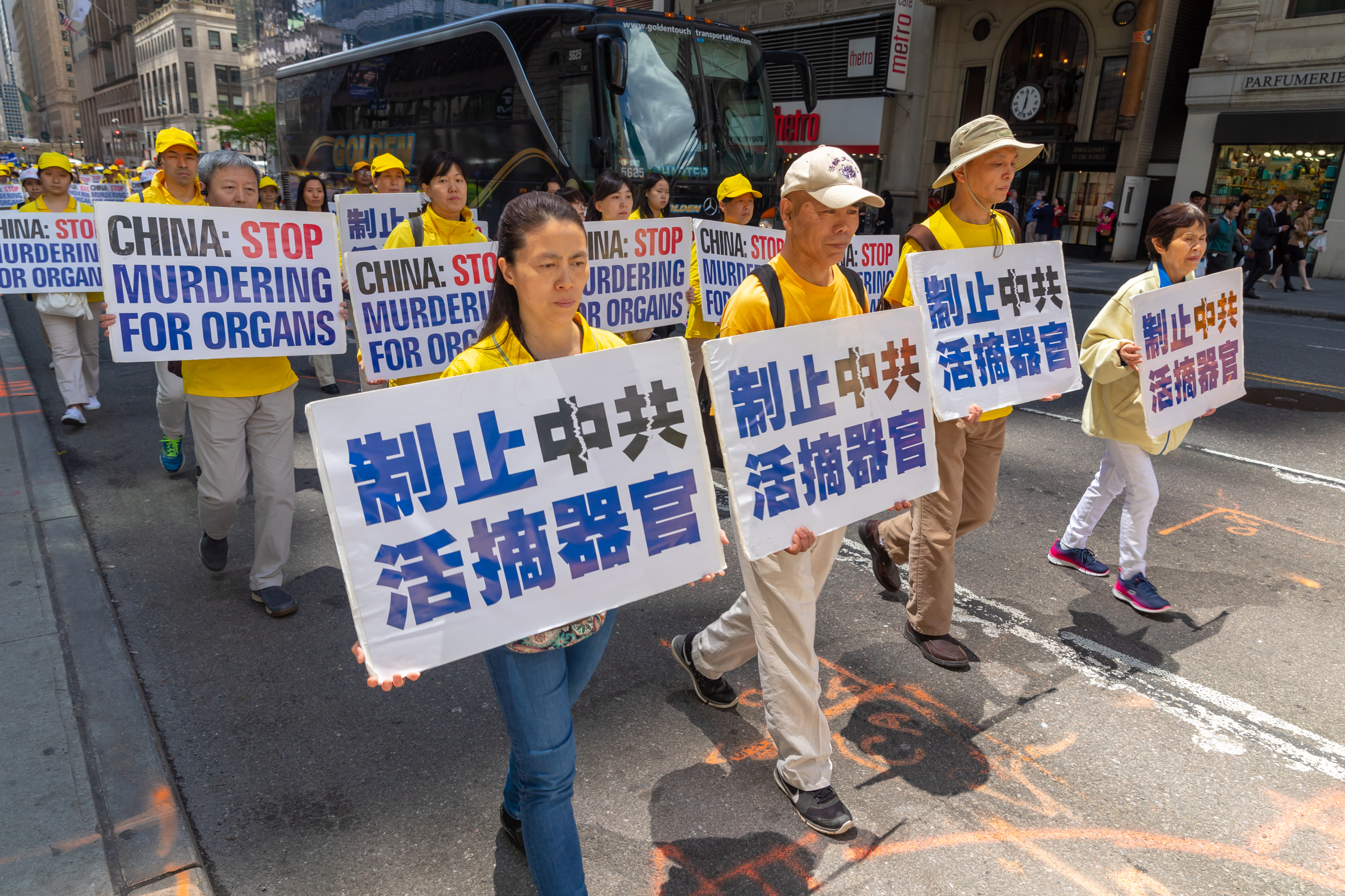 第二部分“停止迫害法轮功”,有悼念被迫害致死的法轮功学员的花圈队,庄严肃穆;还有要求停止活摘器官、法办江泽民等七个方阵。