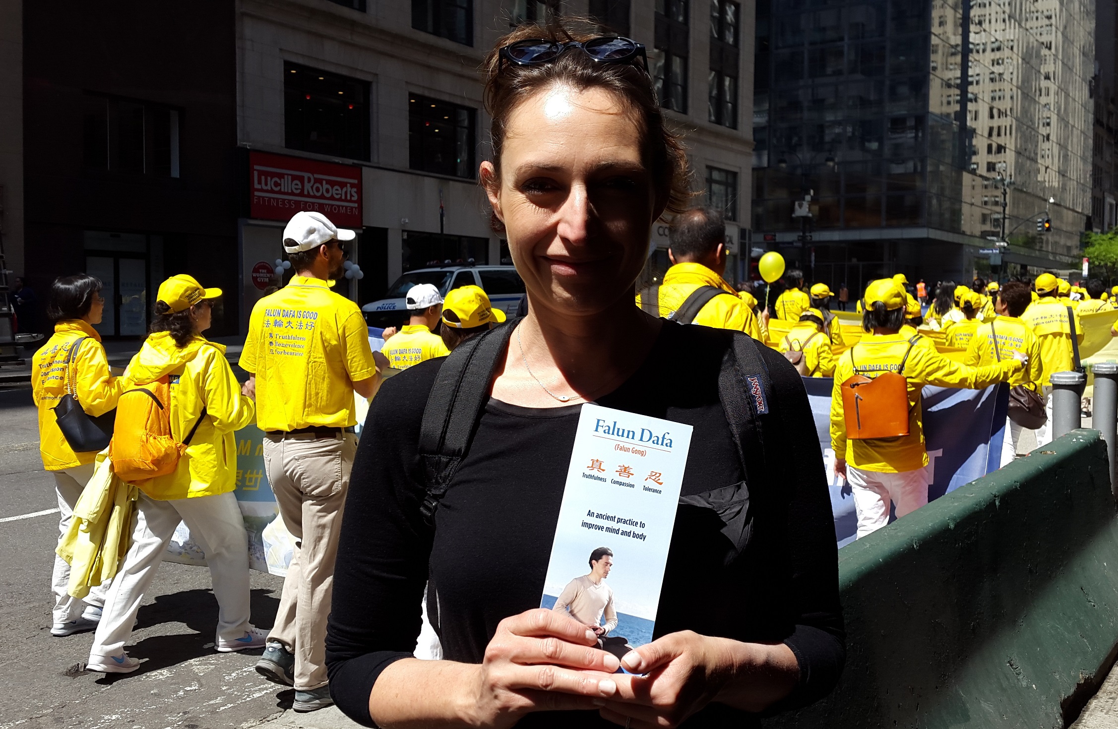 来纽约出差的法国教育工作者费雷罗·卡罗琳(Ferrero Caroline)表示:“看到法轮功学员从内心表现出来的善良又祥和的美好、纯真,太令人高兴了!如此美丽感人!我喜爱亚洲文化的原理。我对真、善、忍很认同,我也喜欢打坐,我将回去对法轮功了解更多。”