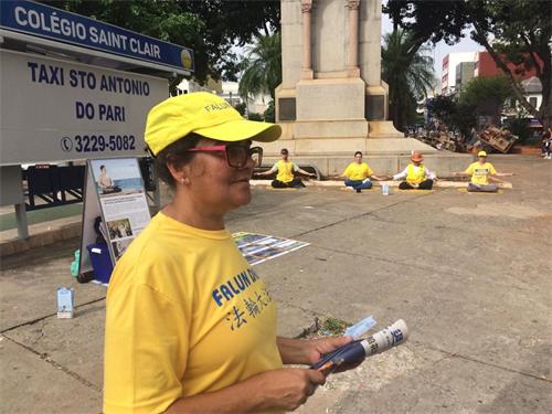 另一些学员在街心广场上炼功、讲真相。挂上“庆祝5.13世界法轮大法日”及“法轮大法好”的横幅,还有介绍法轮功的展板及法轮大法弘传世界的图片。摩洛哥裔的阿伯杜尔(Abdul)先生看到学员们的炼功场面后,高兴地与学员交谈起来,他来巴西前就结识了法轮功,很高兴遇见了同修们,表示今后要与大家一起洪法和反对中共的迫害。还有路人加入到学员们身边学习抱轮动作。有孟加拉裔和阿拉伯地区的人及当地巴西人经过广场,表示法轮功教人向善、做好人,他们喜欢。