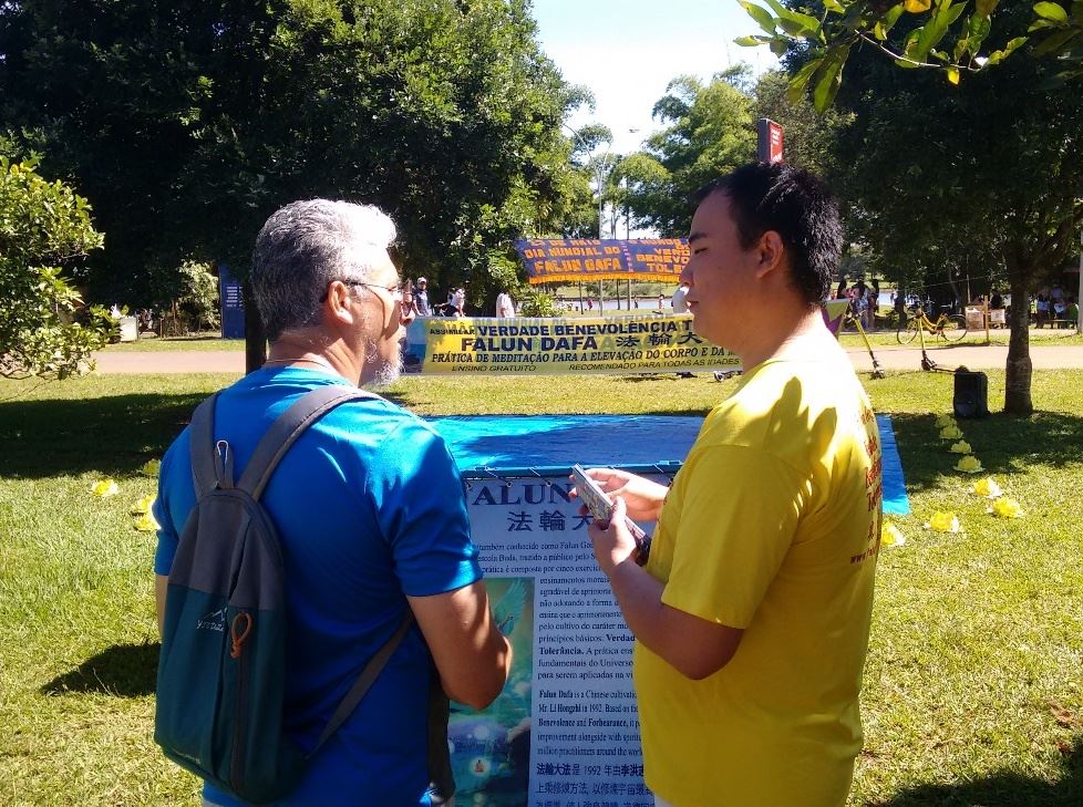 老先生瓦武吉尔(Valdir Colatto)与学员交谈了许久,对中共违反普世价值迫害法轮功表示谴责,对法轮大法不同于其它宗教的修炼形式非常感兴趣,并感谢学员们给这里带来了美好的信息。