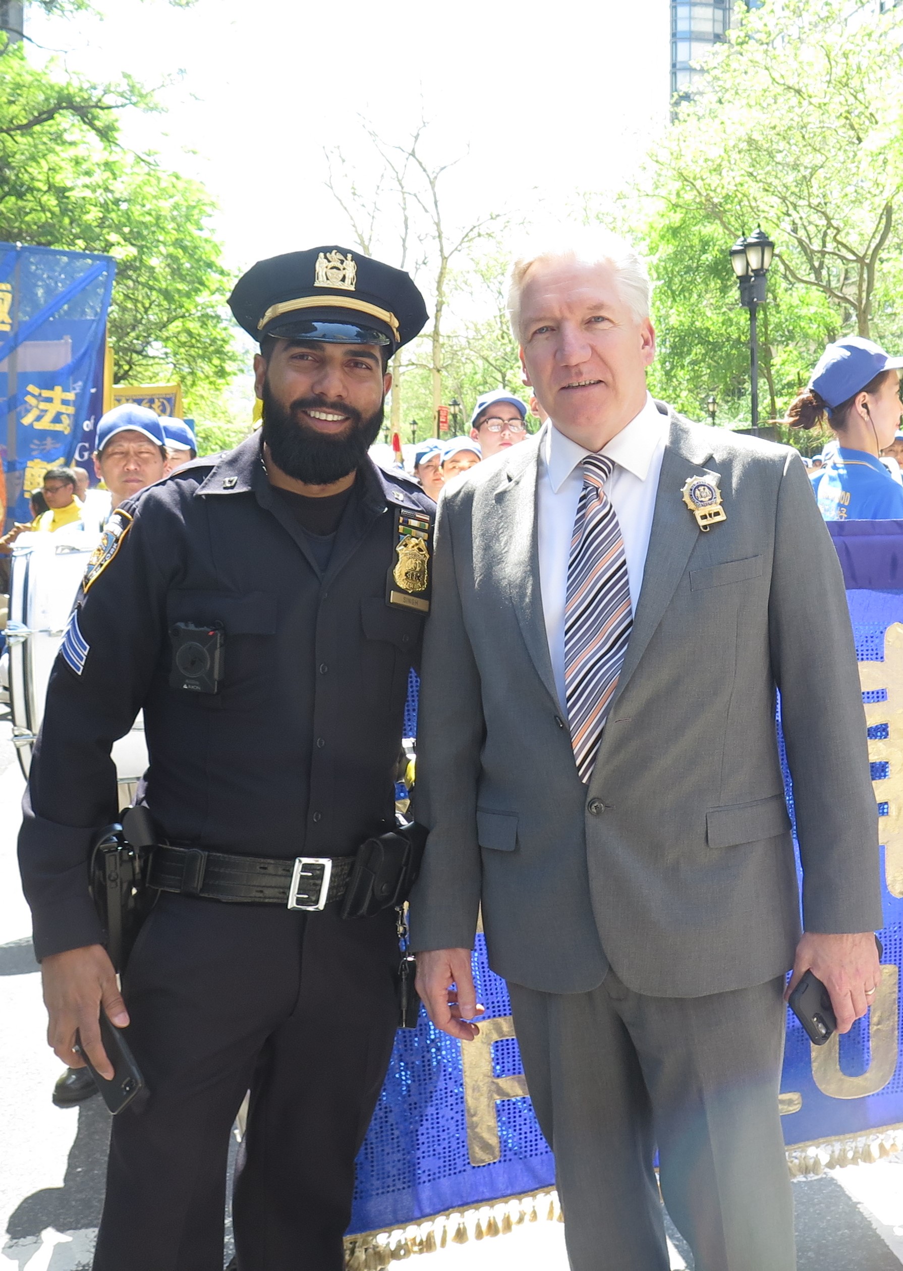 纽约警方负责维护今天集会游行秩序的负责人弗兰克·博古(Frank Bogucki)神情轻松地在现场与警官拉维·辛格(Ravi Singh)交谈。他表示:“这是我们每年一次参加的活动。我们警方在这里是为了保障活动的安全。今天是美好的一天。”