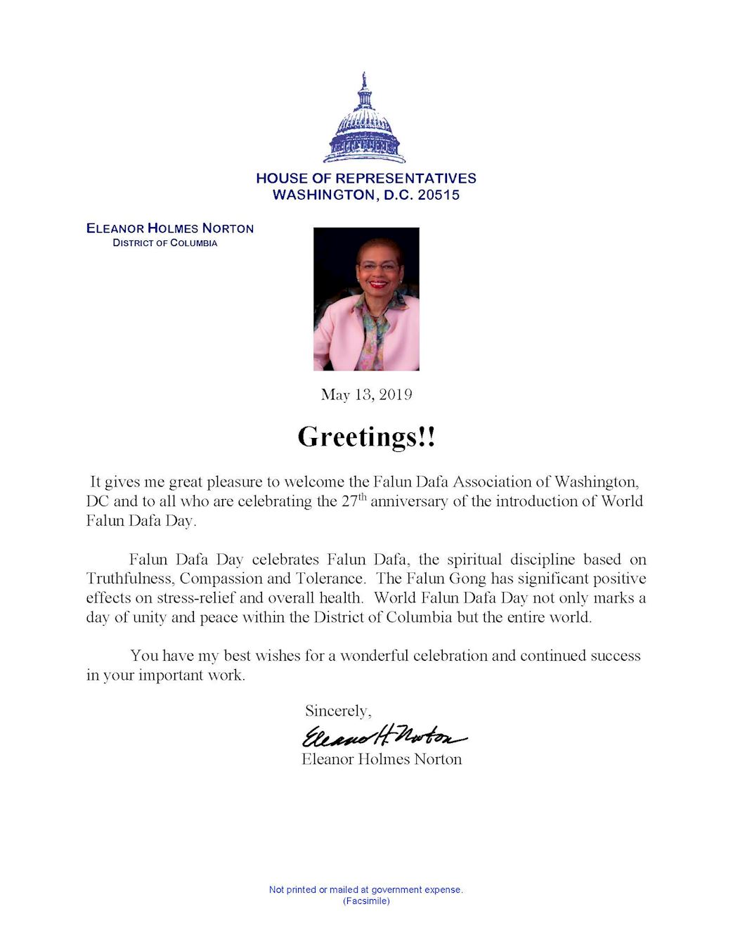 【明慧网二零一九年五月十九日】在“世界法轮大法日”及法轮大法传世二十七周年之际,美国首都华盛顿哥伦比亚特区联邦众议员埃莉诺·霍姆斯·诺顿(Eleanor Holmes Norton)致信祝贺。