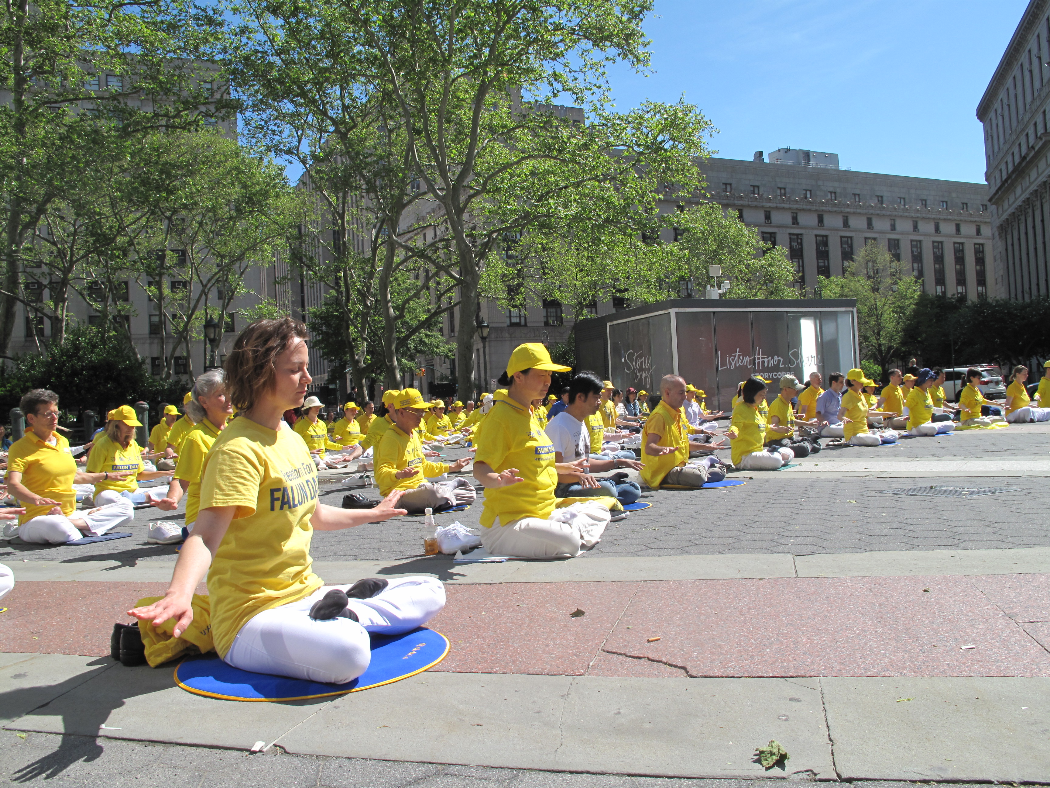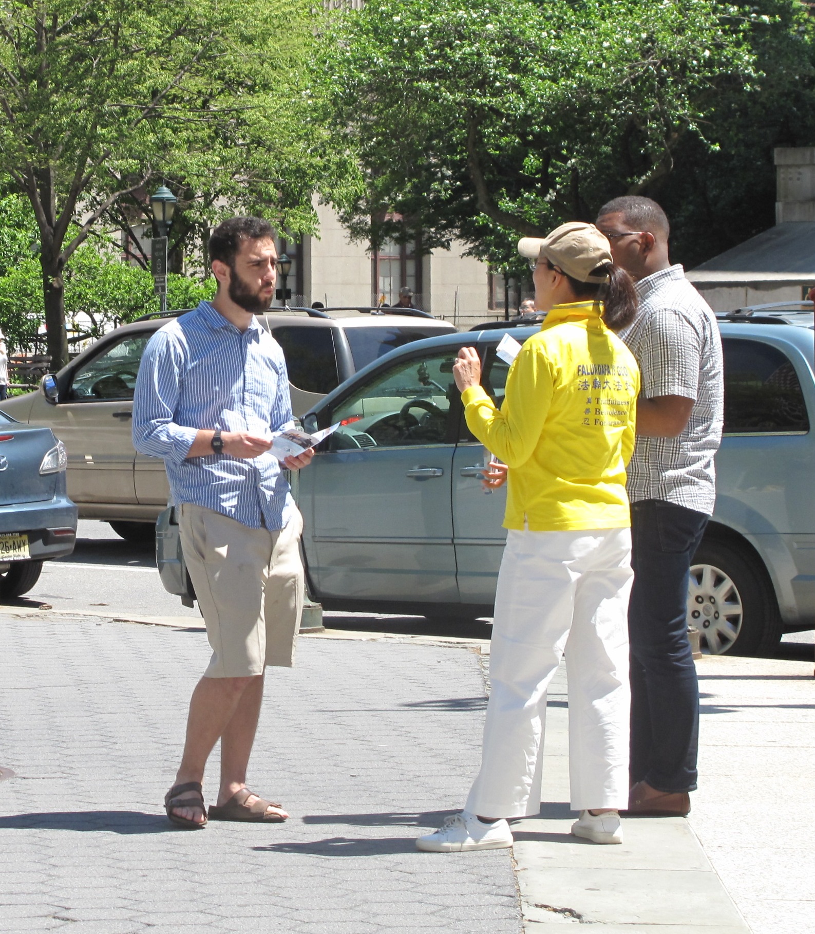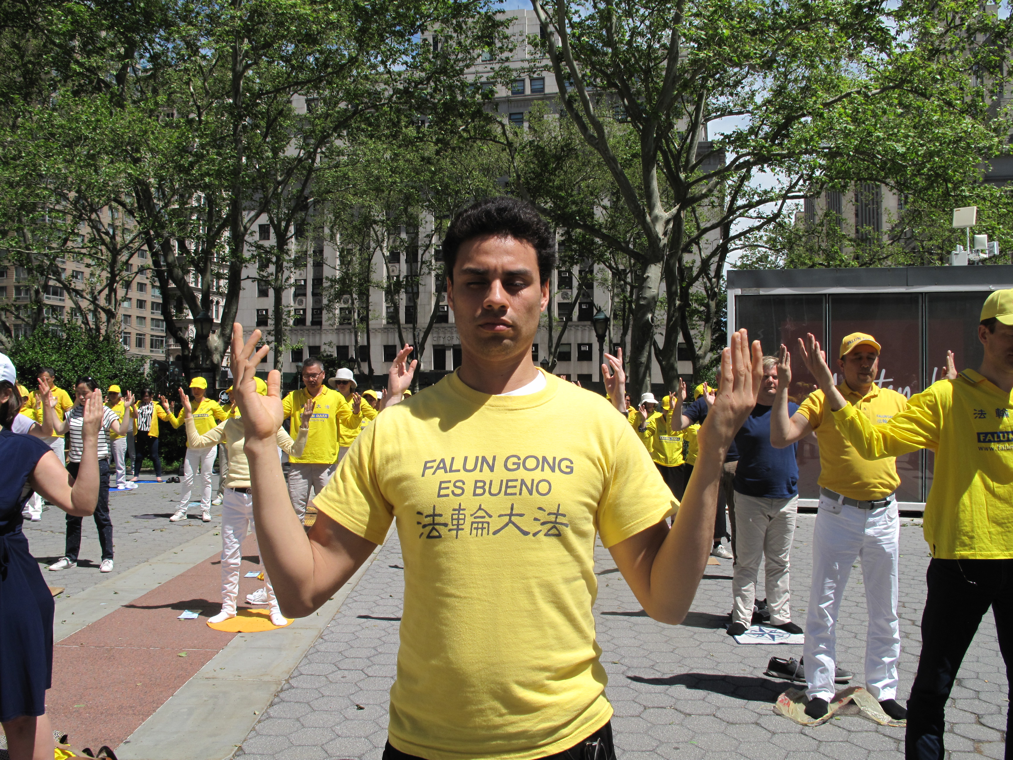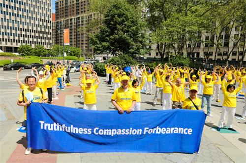 【明慧网二零一九年五月十九日】(明慧记者方元、德祥美国纽约采访报道)二零一九年五月十八日,参加第二十届世界法轮大法日庆祝活动的部分法轮功学员在纽约富利广场(Foley Square)集体炼功,向美国社会民众和各国游客展示法轮功的美好。有路人当场学炼法轮功。