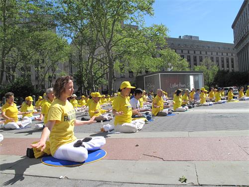 图8:二零一九年五月十八日,瑞典法轮功学员斯万(Sven)在纽约富利广场(Foley Square)参加集体炼功。