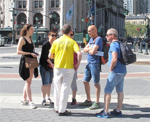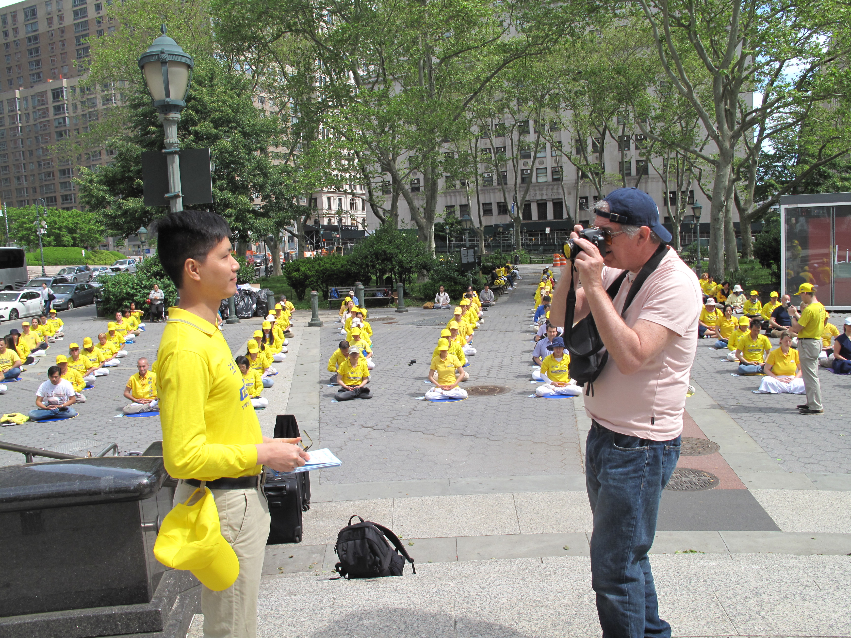 图7:二零一九年五月十八日,从美国宾州匹兹堡来纽约游览的知名摄影师查克·纳齐(Chuck Nacke) 在富利广场遇到正在集体炼功的法轮功学员。